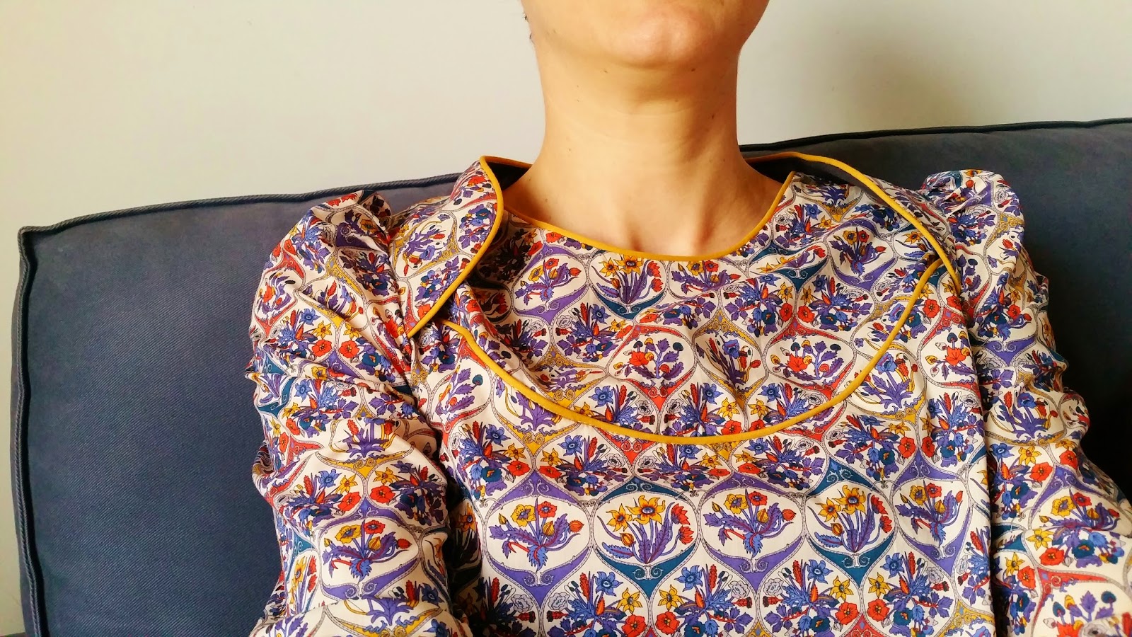 Seconde version : en liberty Opie bleu orange, passepoil-maison moutarde