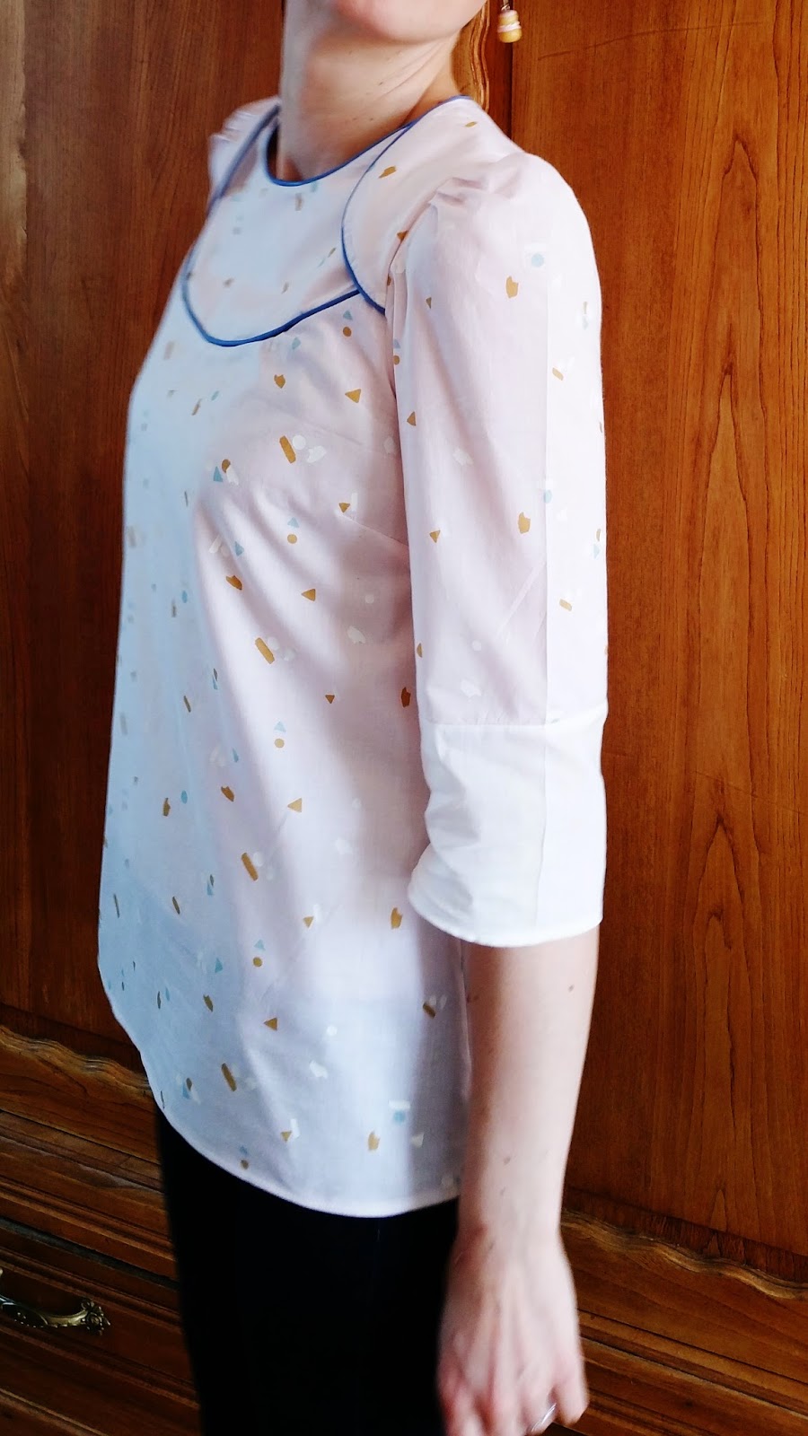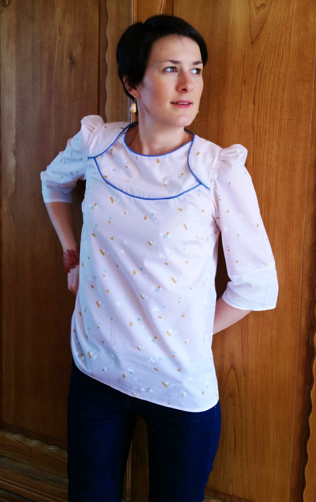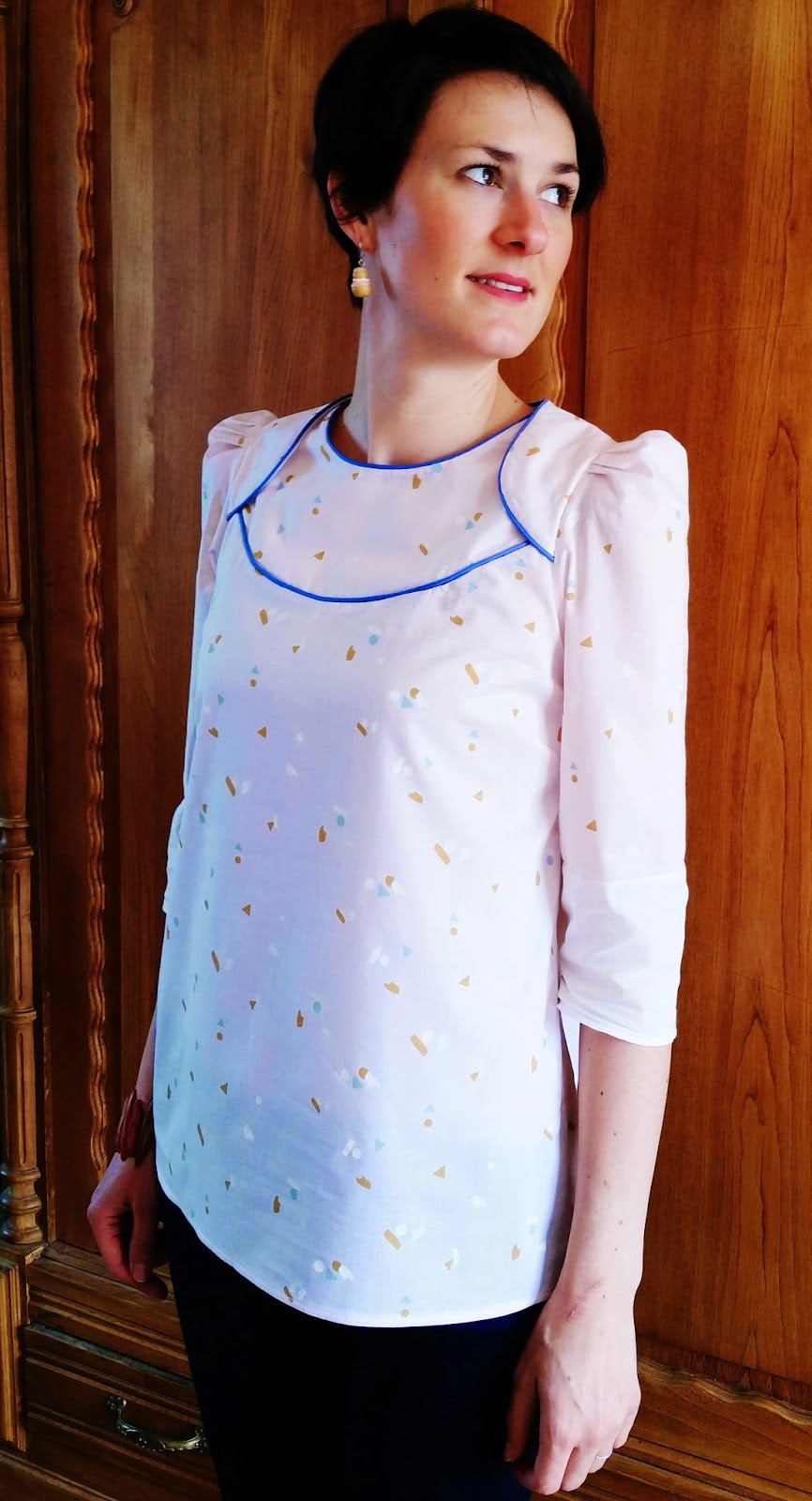 Concernant la dernière, elle a été cousue dans le tissu Abstract d’Atelier Brunette avec du passepoil-maison bleu assorti!