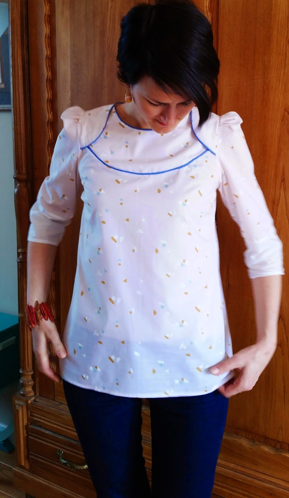 C’est pour cela que, pour avoir mes manches 3/4, j’ai utilisé des chutes de tissu, utilisées aussi pour doubler les empiècements du haut, devant et dos!