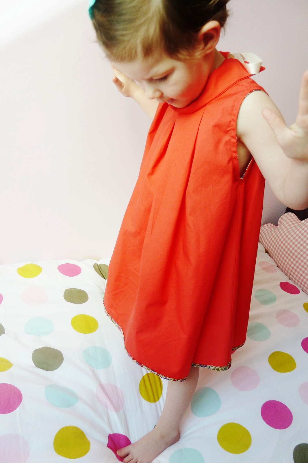 | Robe Alula de Grains de couture, réalisée en 6 ans pour une poupette de bientôt 4 ans, en popeline corail Je ne regrette pas le 6 ans, le 4 ans aurait été trop court je pense. |