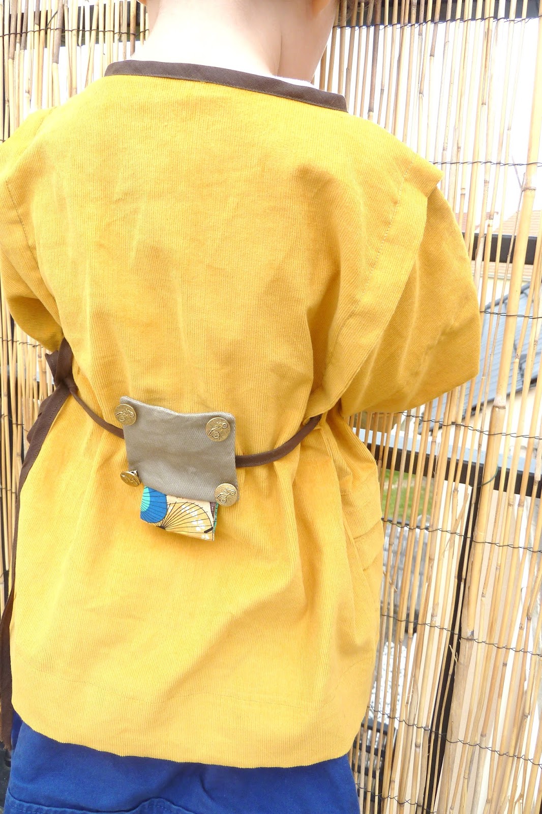 Une jolie boutonnière devant avec un bouton doré qui s’accorde aussi très bien avec le moutarde ( on ne fait rien au hasard dans mon bazar! ) et un biais chocolat pour nouer le tout