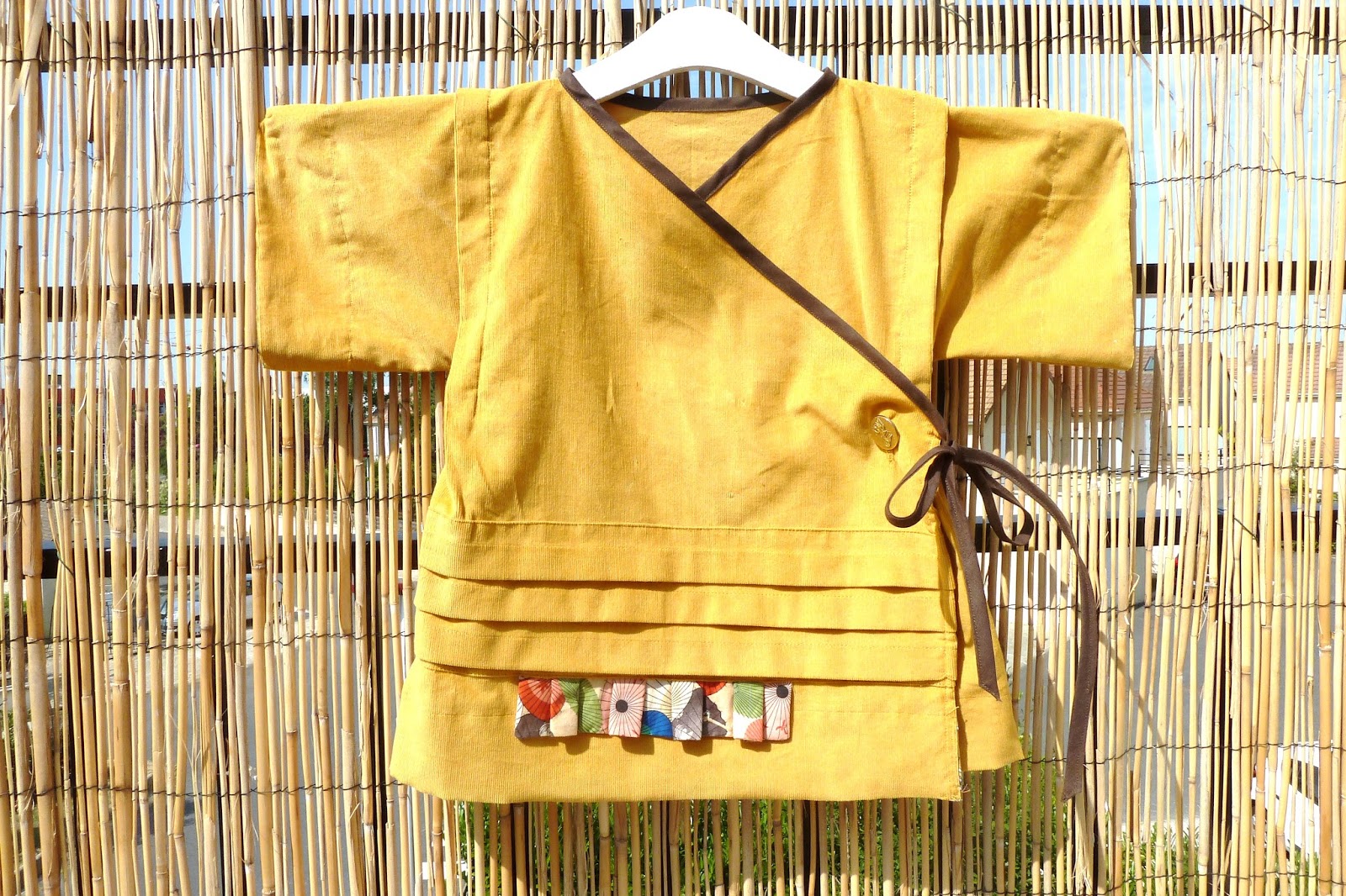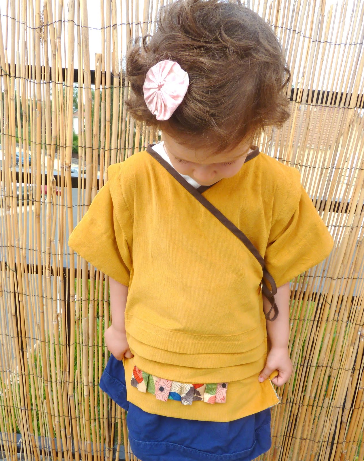 –> Kimono Polaris réalisé en taille 4 ans pour Léontine, 3 ans et 3 mois. Tissu en velours milleraie moutarde, tissu coton ombrelle et boutons dorés from la caverne de Madame Cactus pour les ourlets rapportés des manches et le devant, biais chocolat et popeline fleurs et moutarde pour l’ourlet rapporté du bas issu de mon stock perso!