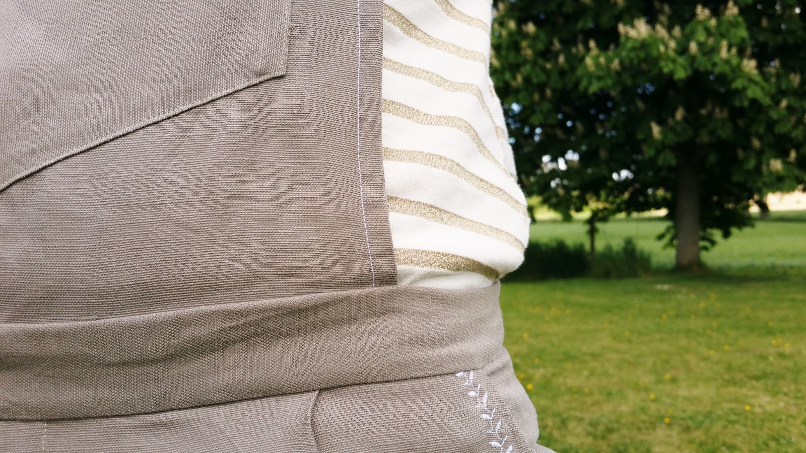 Je me suis amusée à réaliser un point broderie sur le haut de la poche et au niveau des poches… simple mais efficace!! Et j’ai soigné les surpiqûres.