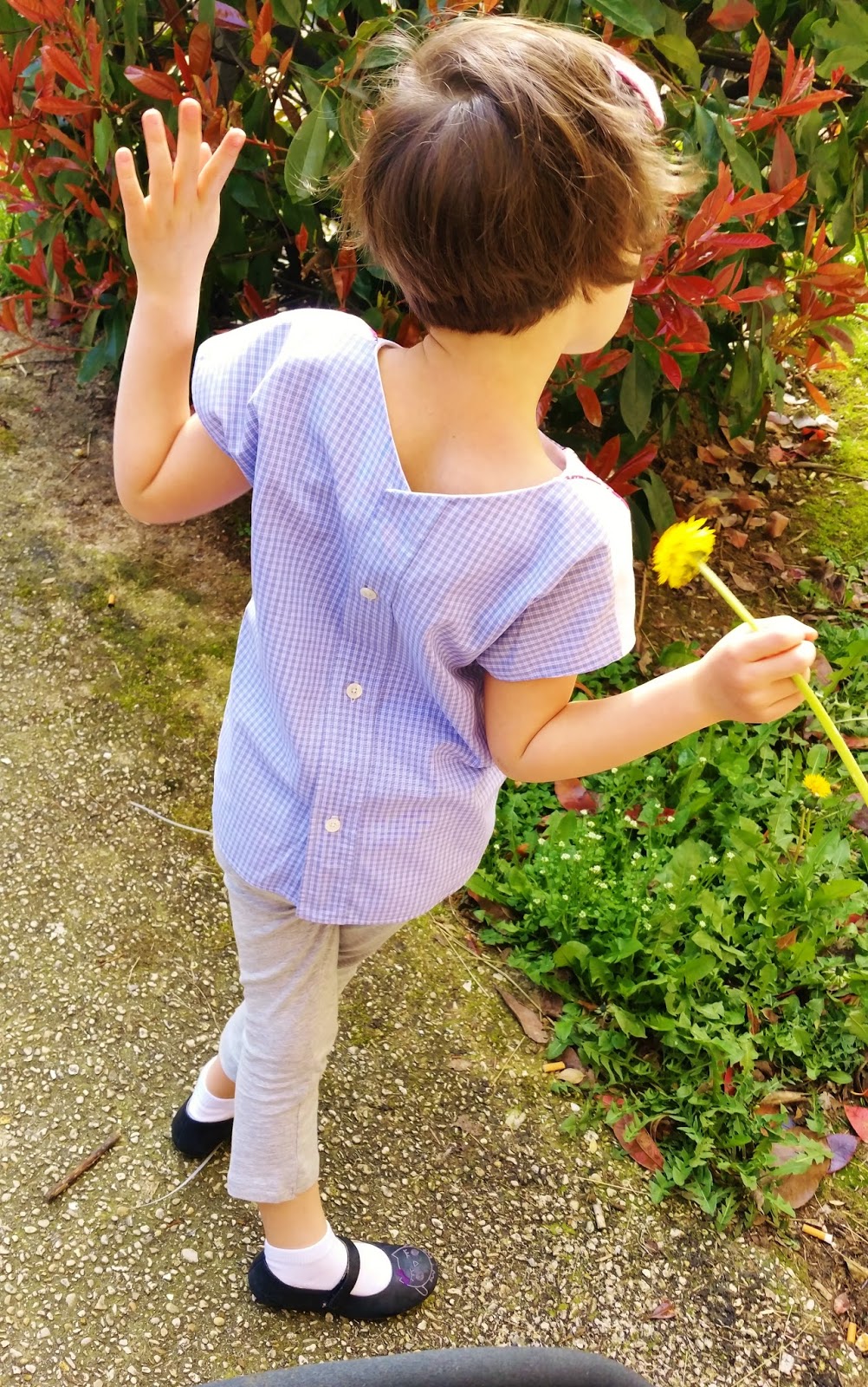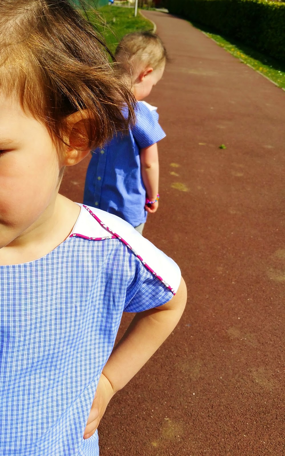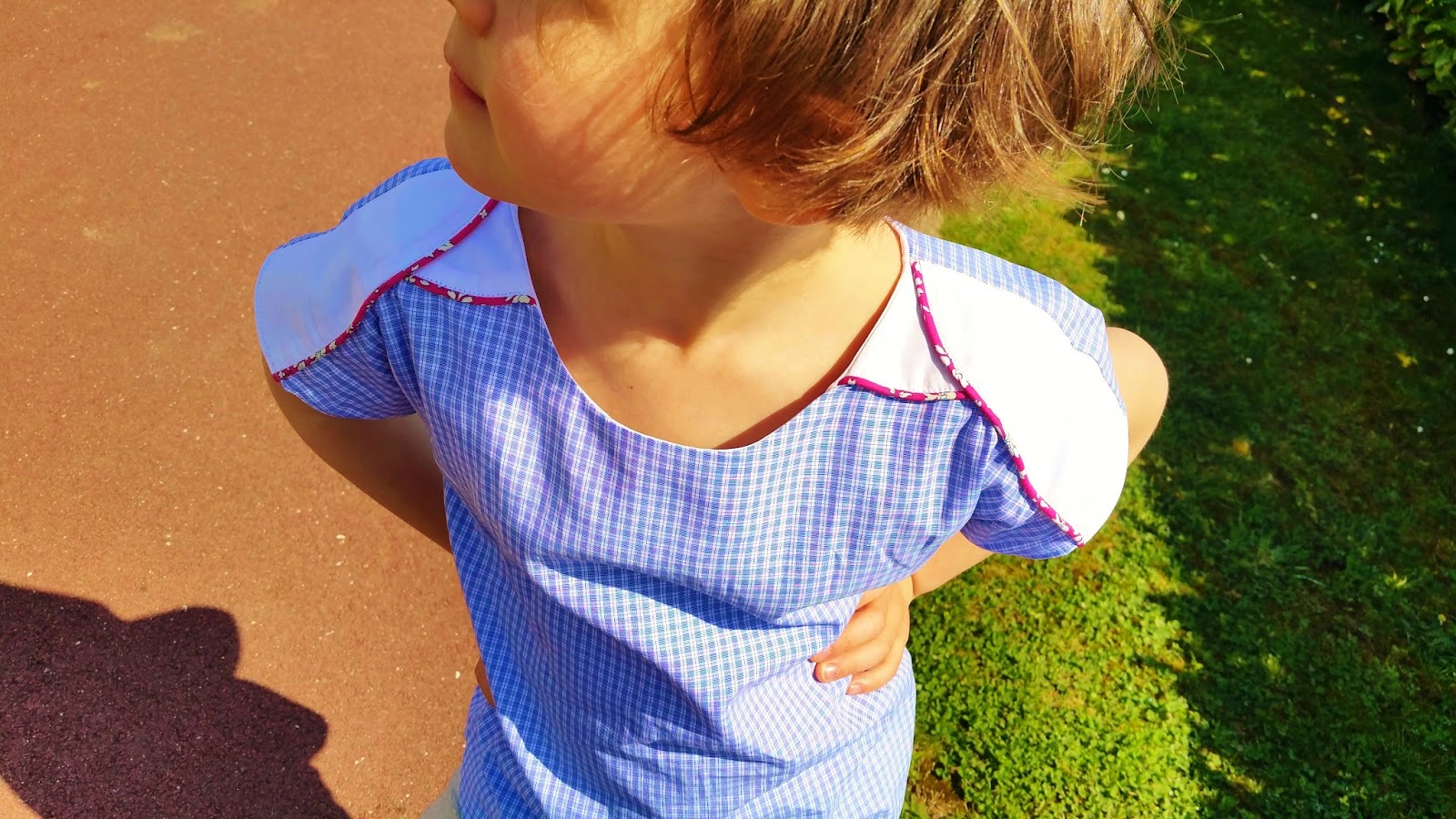 La looooose !!Bon, j’exagère hein mais c’est un peu ça …En fait le trop top c’est LE patron à avoir absolument!! C’est pas compliqué, à lui seul il vous remplit la garde robe de vos rejetons en un rien de temps! Et impossible de deviner que toutes les versions proposées proviennent du même patron!!Pour le découvrir je vous invite à cliquer ICI J’ai rapidement craqué pour sa version B et son adorable V dans le dos….Au hasard de ma montagne de chutes de tissu, j’ai retrouvé une chemise de mon mari, déjà découpée, et je me suis vite rendue compte que toutes les pièces rentrait! j’avais oublié l’avantage de coudre petit… Du coup ni une ni deux, j’en ai piqué une seconde!Aujourd’hui, je vous propose donc de découvrir deux versions B : l’une avec un col Claudine et l’autre avec les épaules pétales!
