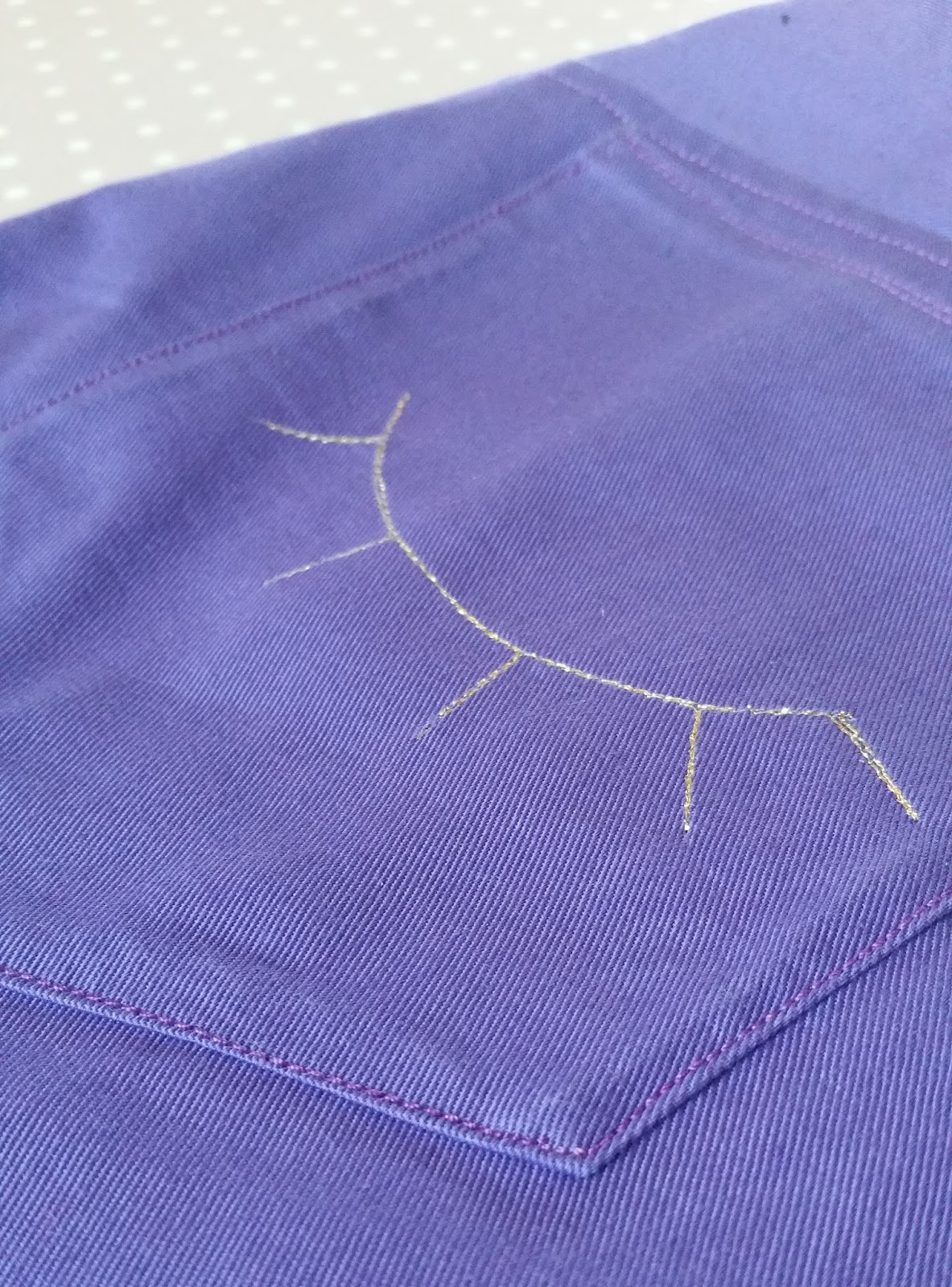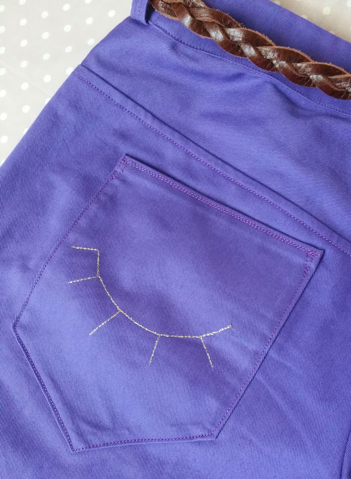 Le détail unique des poches arrières…..!!! Pour ce clin d’œil, j’ai utilisé du fil doré de Mercerie extra, du fil au prix défiant toute concurrence et un adorable SAV!