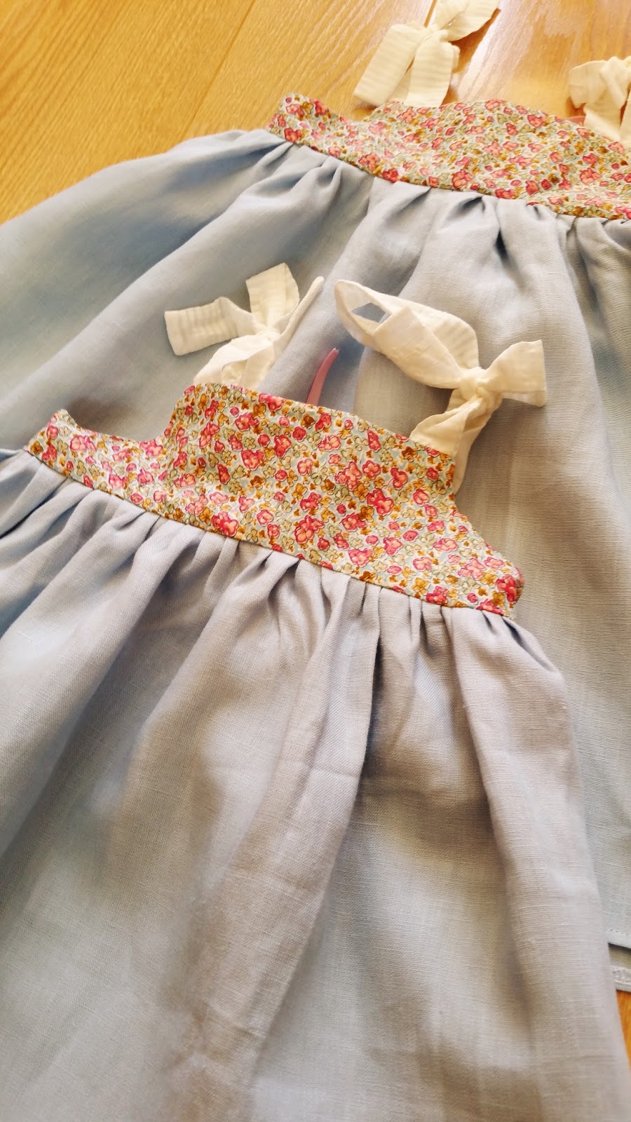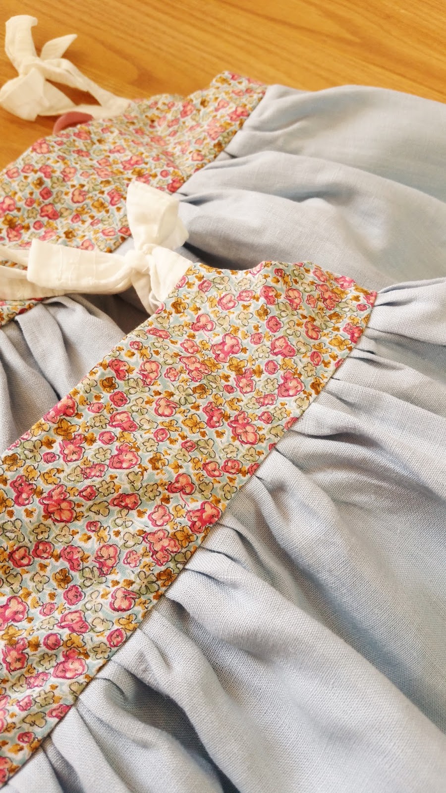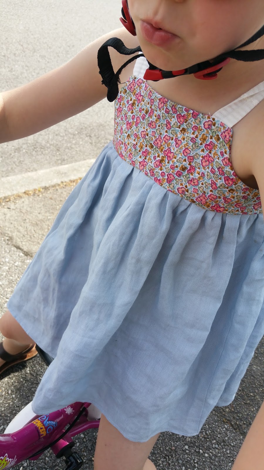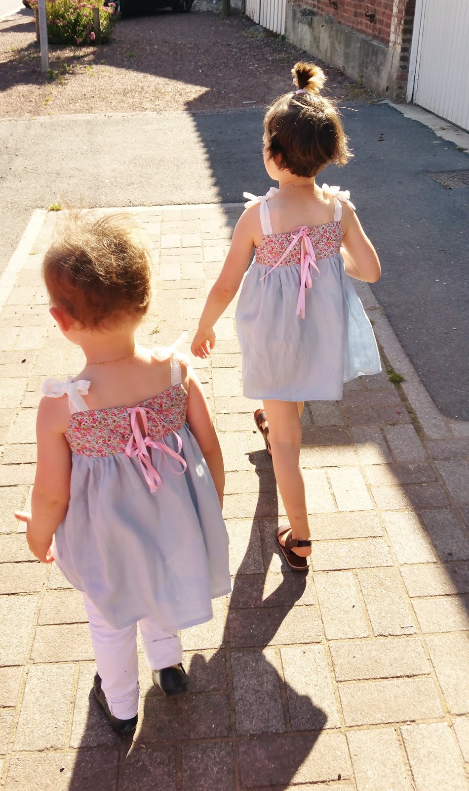 Voilà donc les deux p’tits hauts réalisés pour l’occasion, en lin bleu/coton à fleurs/ruban au dos et bretelles réalisées dans des chutes de tissu