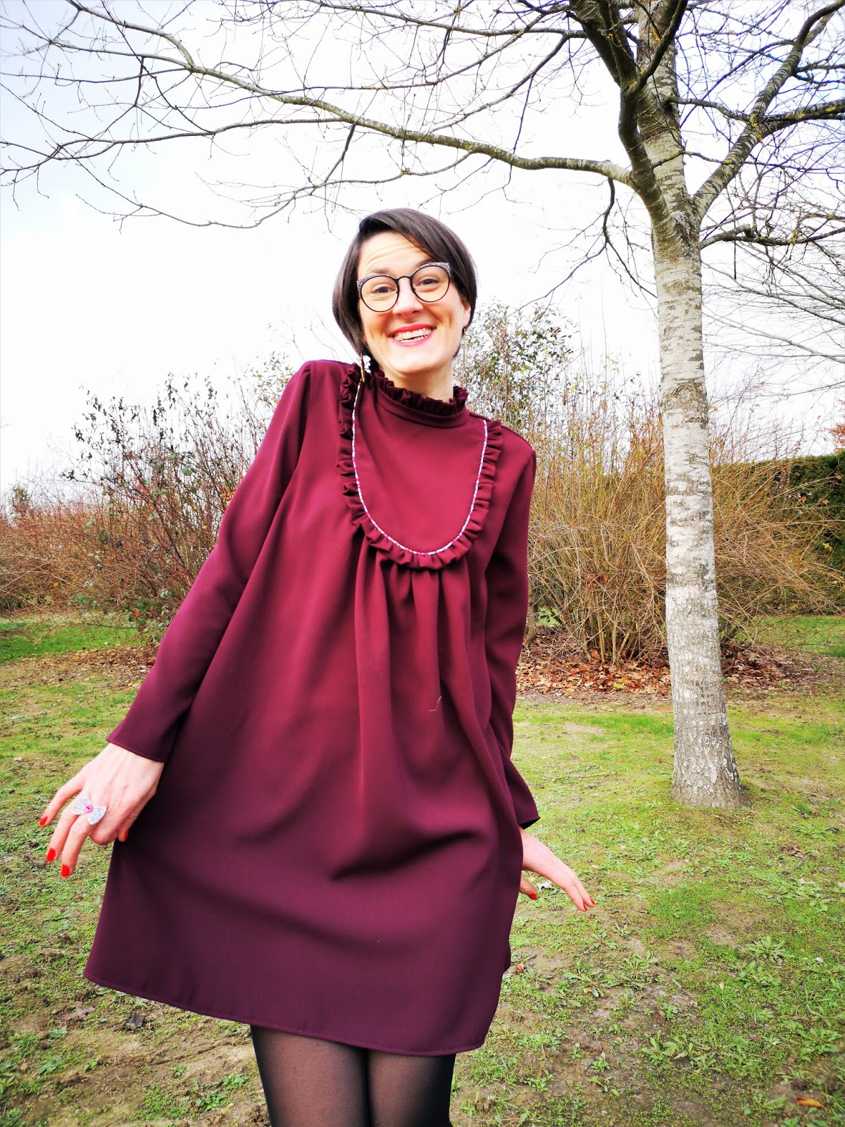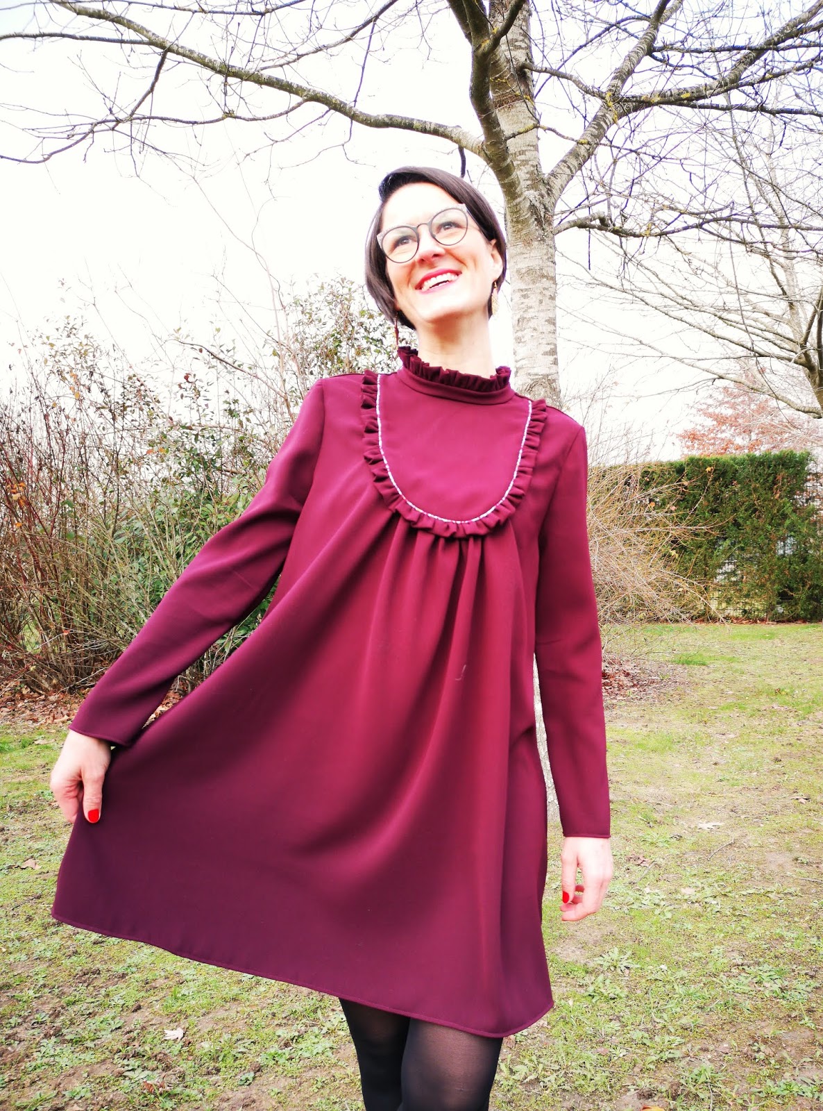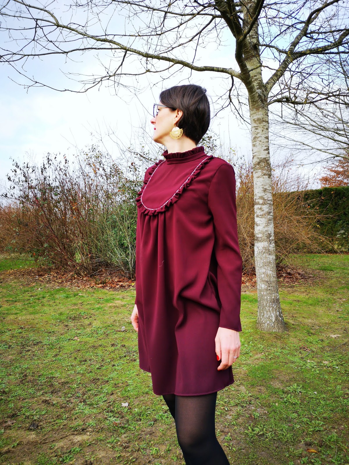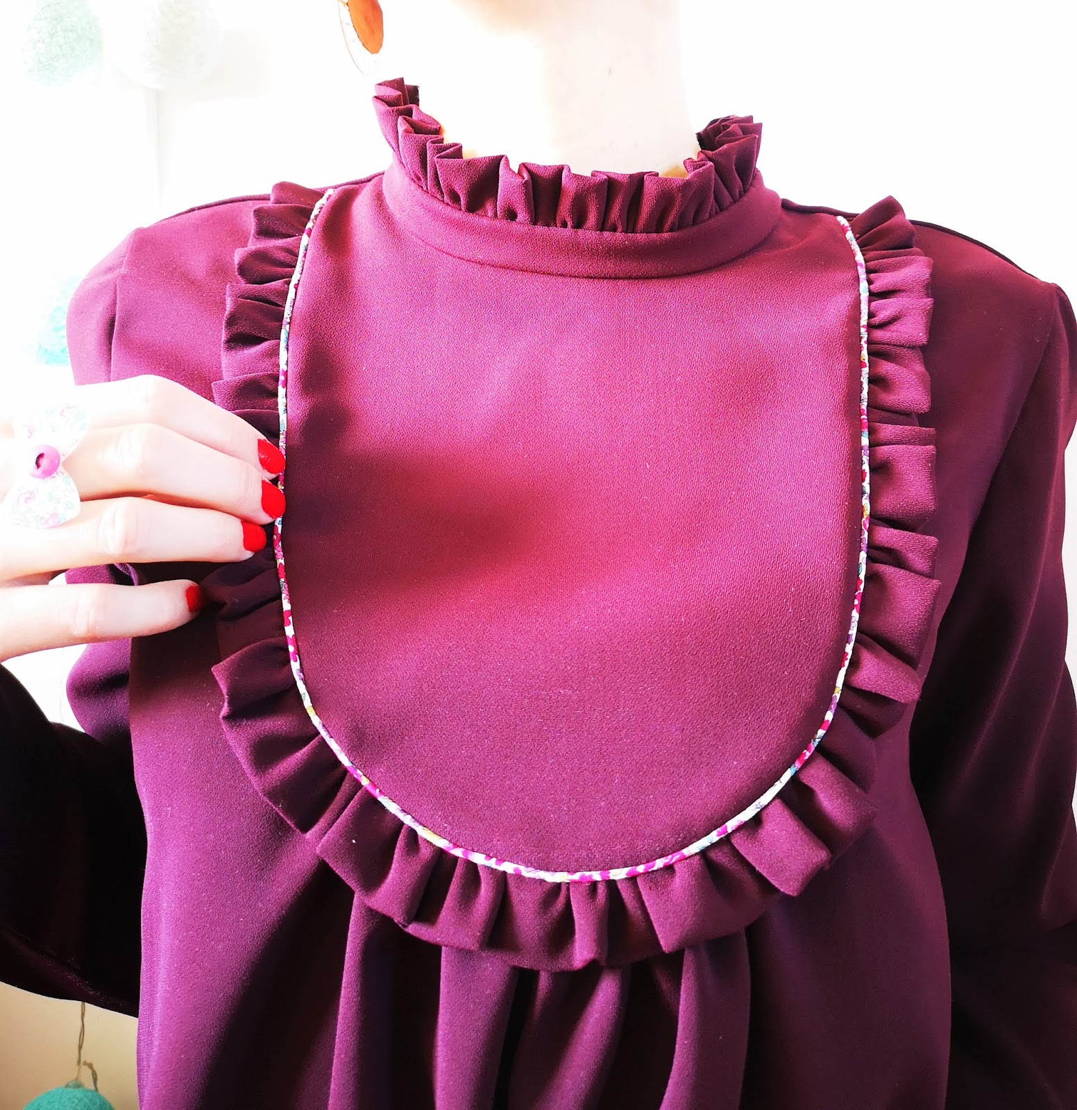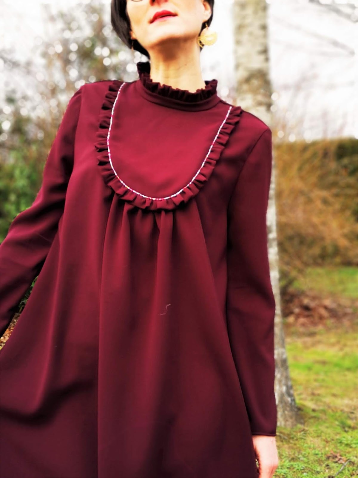 Ta robe est une tuerie ! Et elle te va divinement bien. Cette couleur est ravissante. J'aime tous ces froufrous et l'empiècement bordé d'un joli passepoil. Modèle réservé aux silhouettes menues et aux cous graciles. Je passe mon tour !
