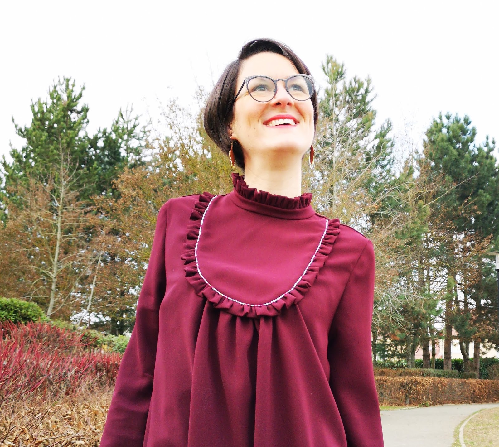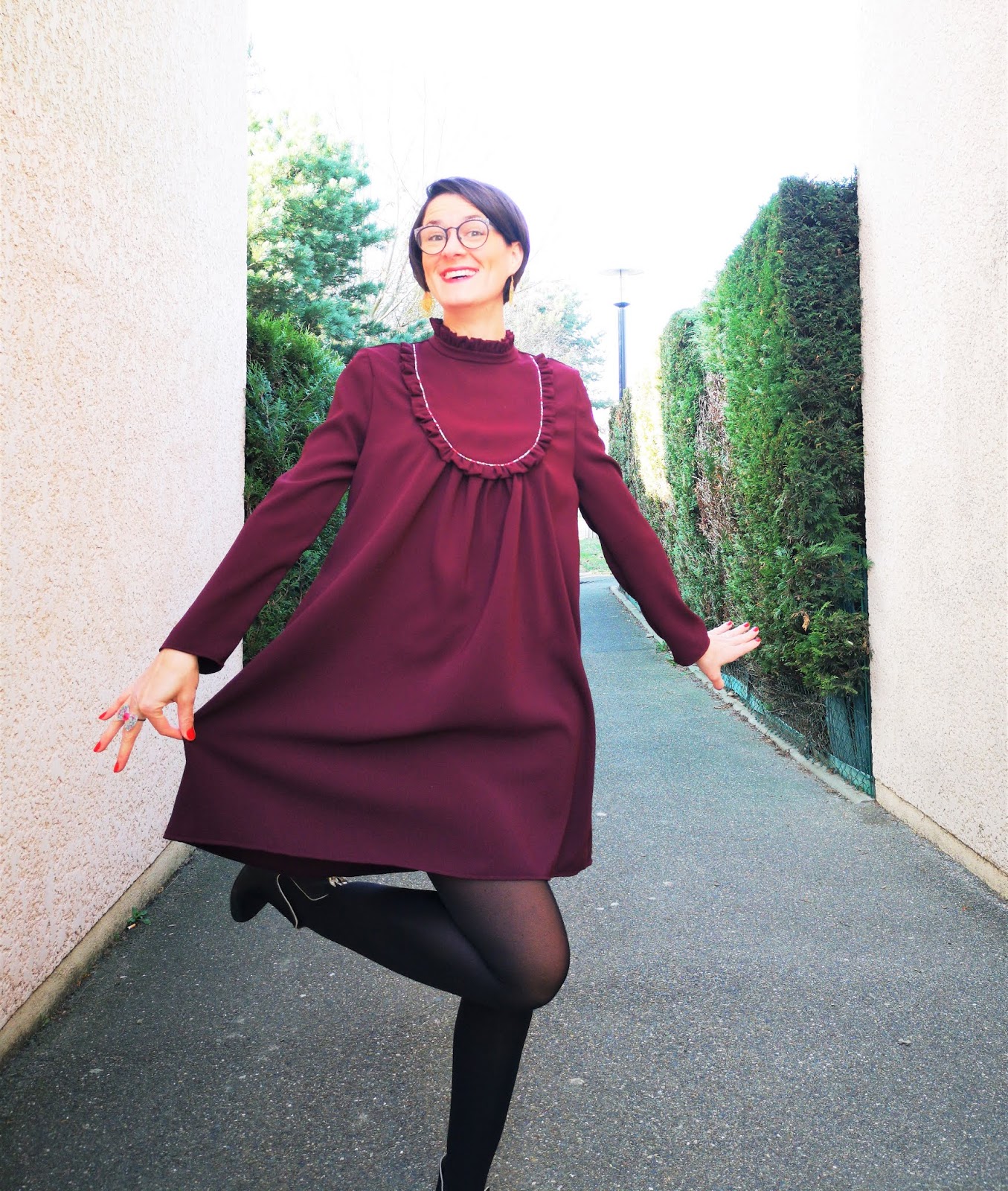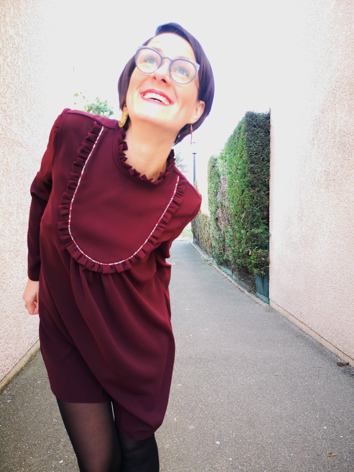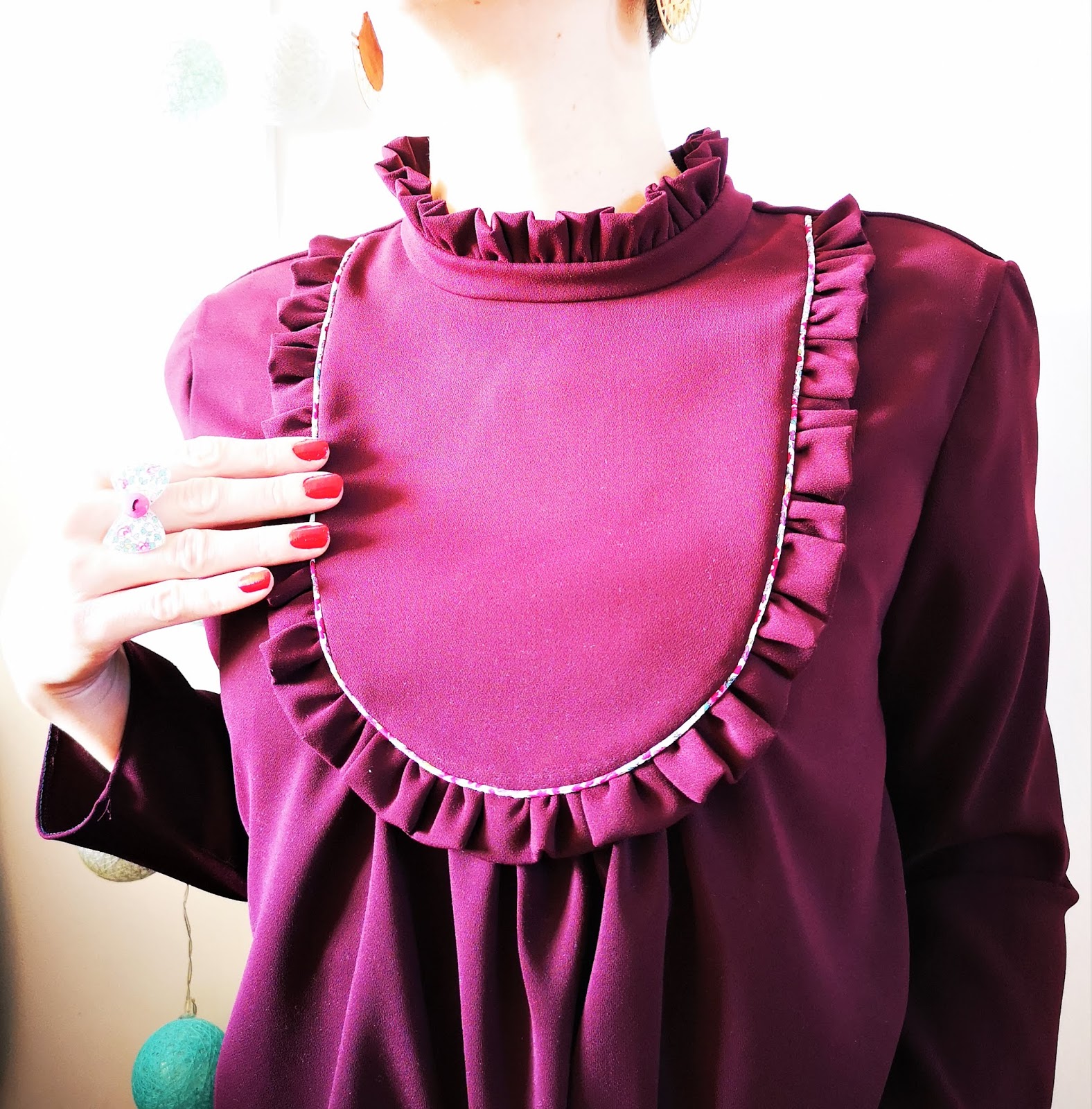 Ta robe est une tuerie ! Et elle te va divinement bien. Cette couleur est ravissante. J'aime tous ces froufrous et l'empiècement bordé d'un joli passepoil. Modèle réservé aux silhouettes menues et aux cous graciles. Je passe mon tour !