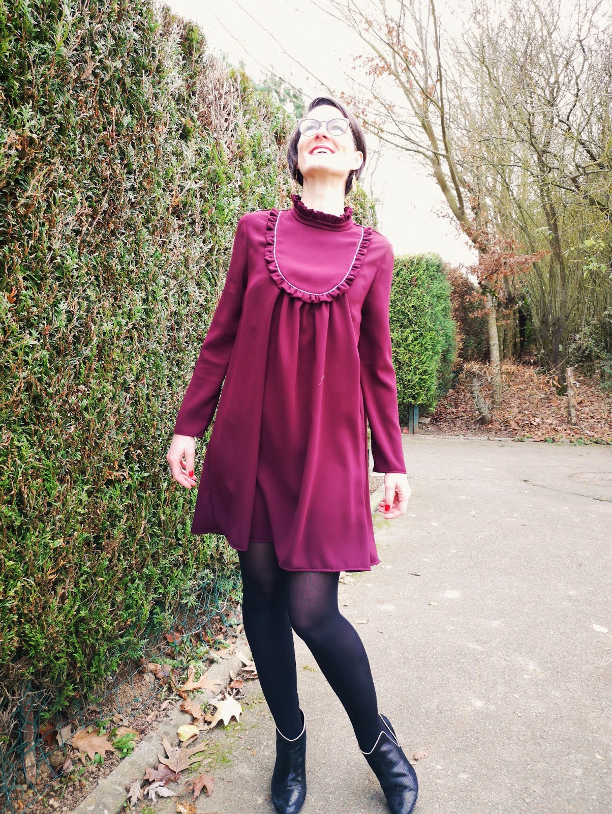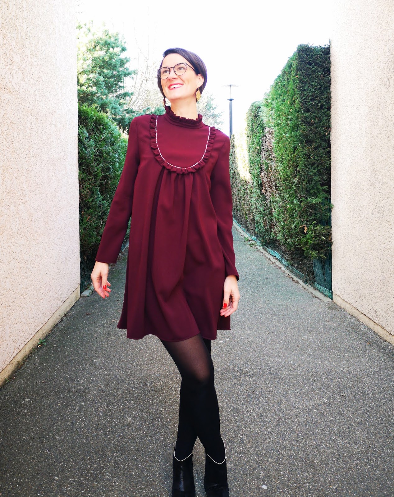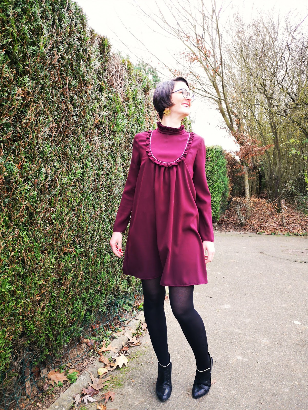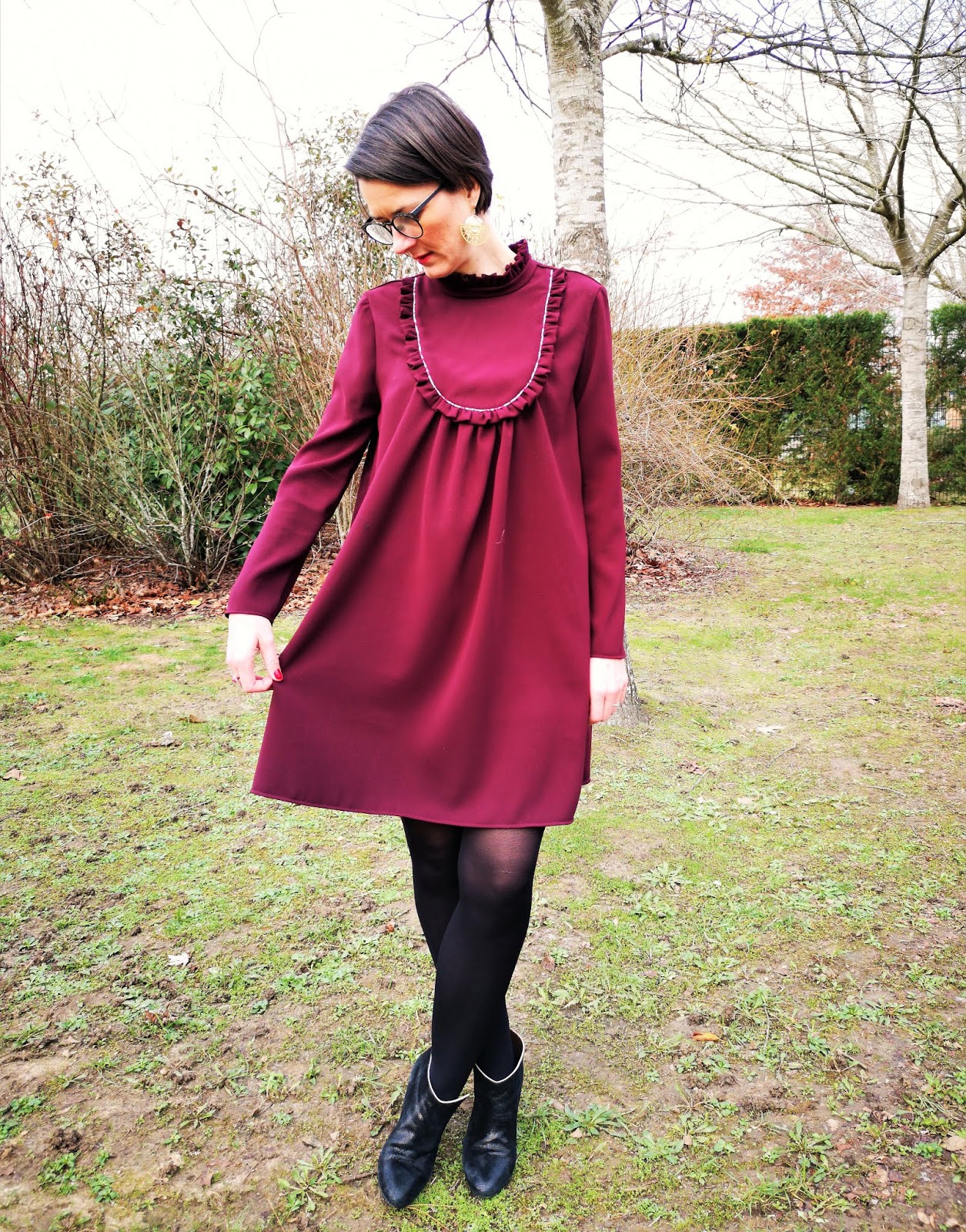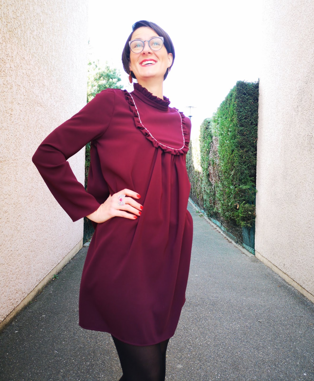 Ta robe est une tuerie ! Et elle te va divinement bien. Cette couleur est ravissante. J'aime tous ces froufrous et l'empiècement bordé d'un joli passepoil. Modèle réservé aux silhouettes menues et aux cous graciles. Je passe mon tour !
