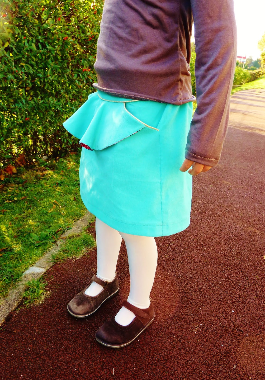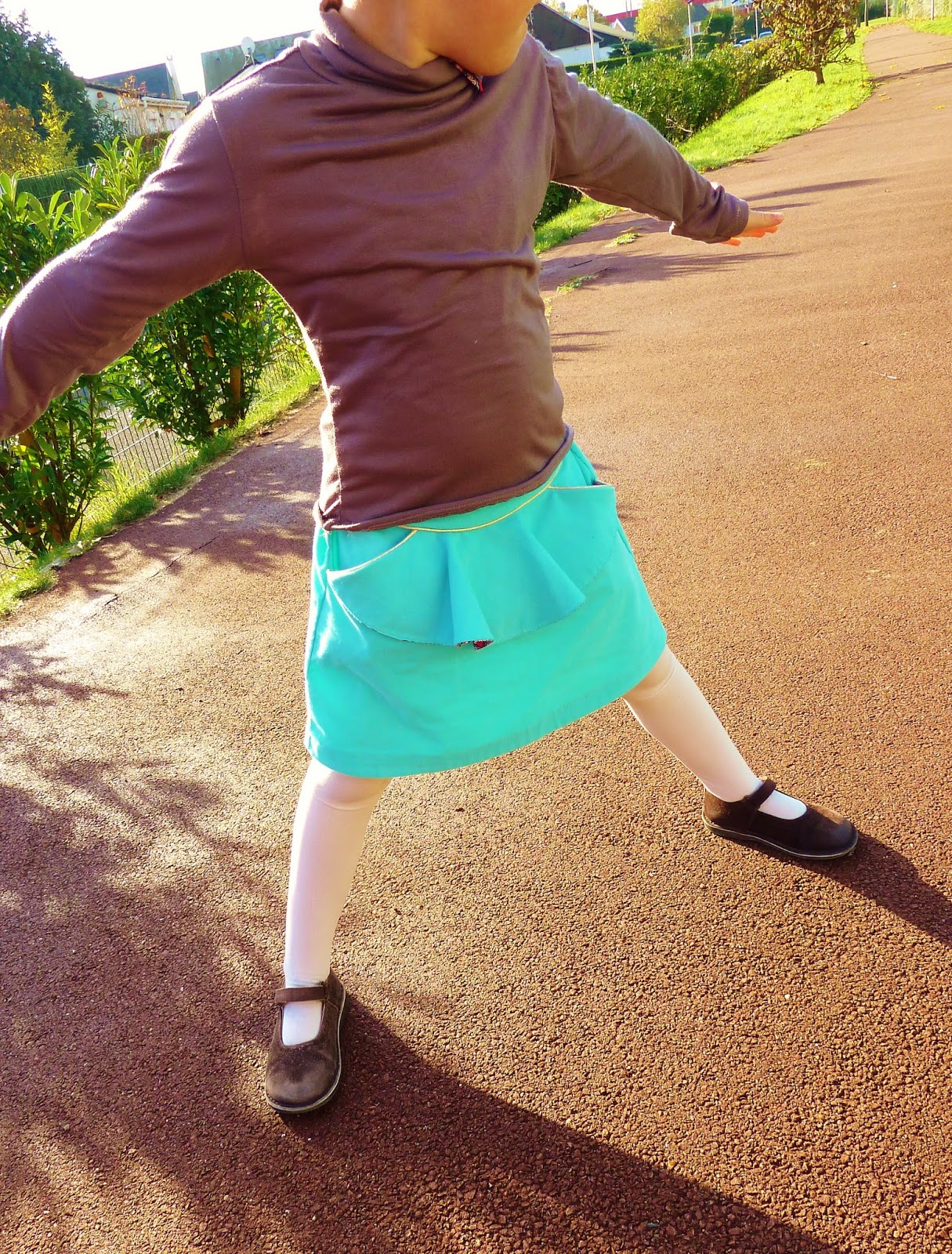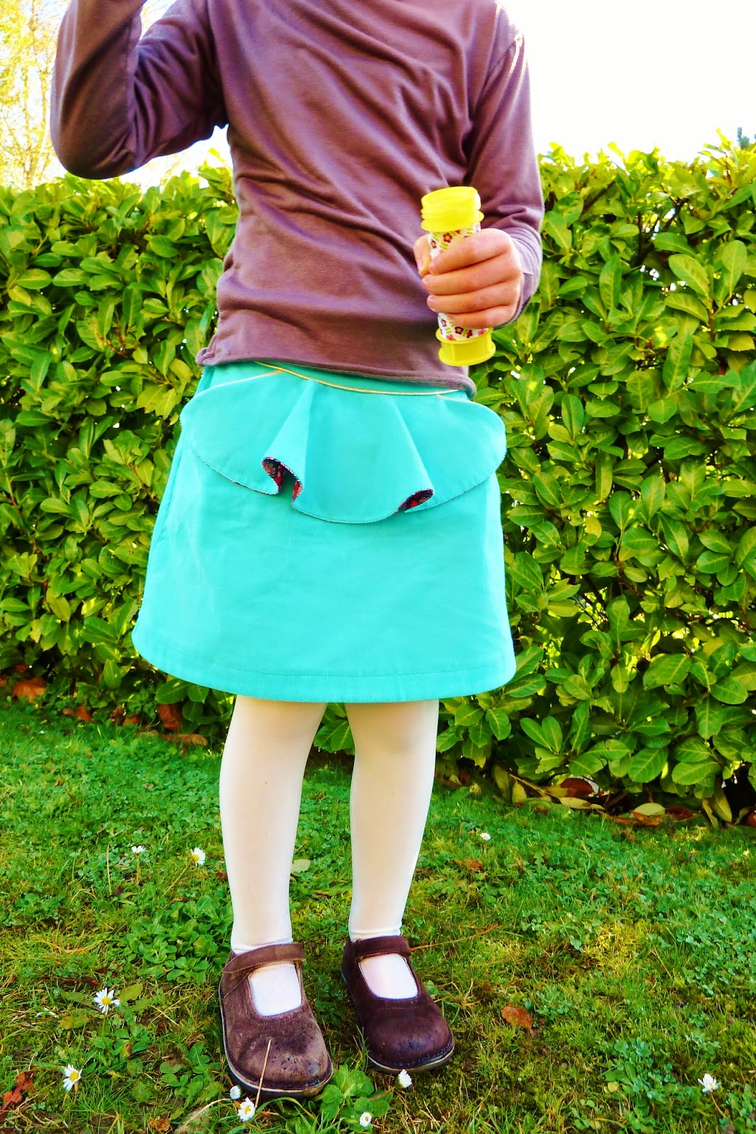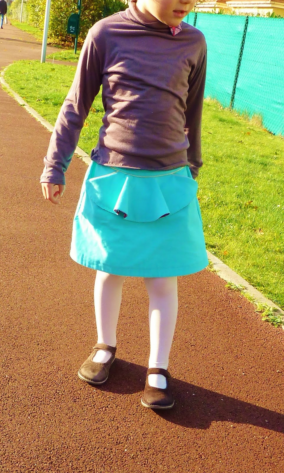 Léontine adore cette jupe, pratique pour l’école grâce à l’élastique et sans doute un peu salissante mais ça, ça m’est égal!