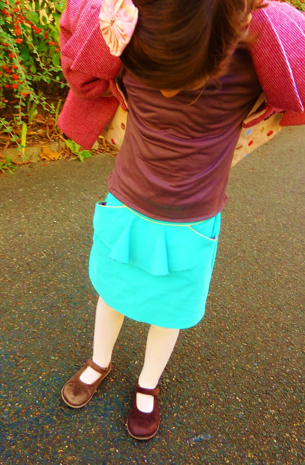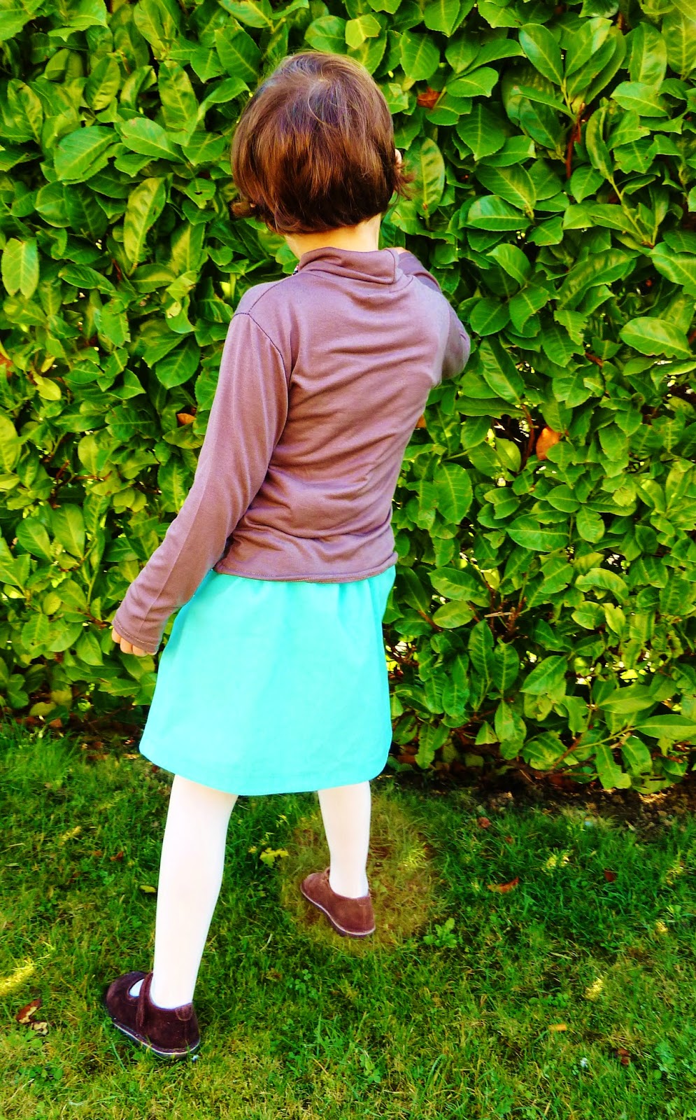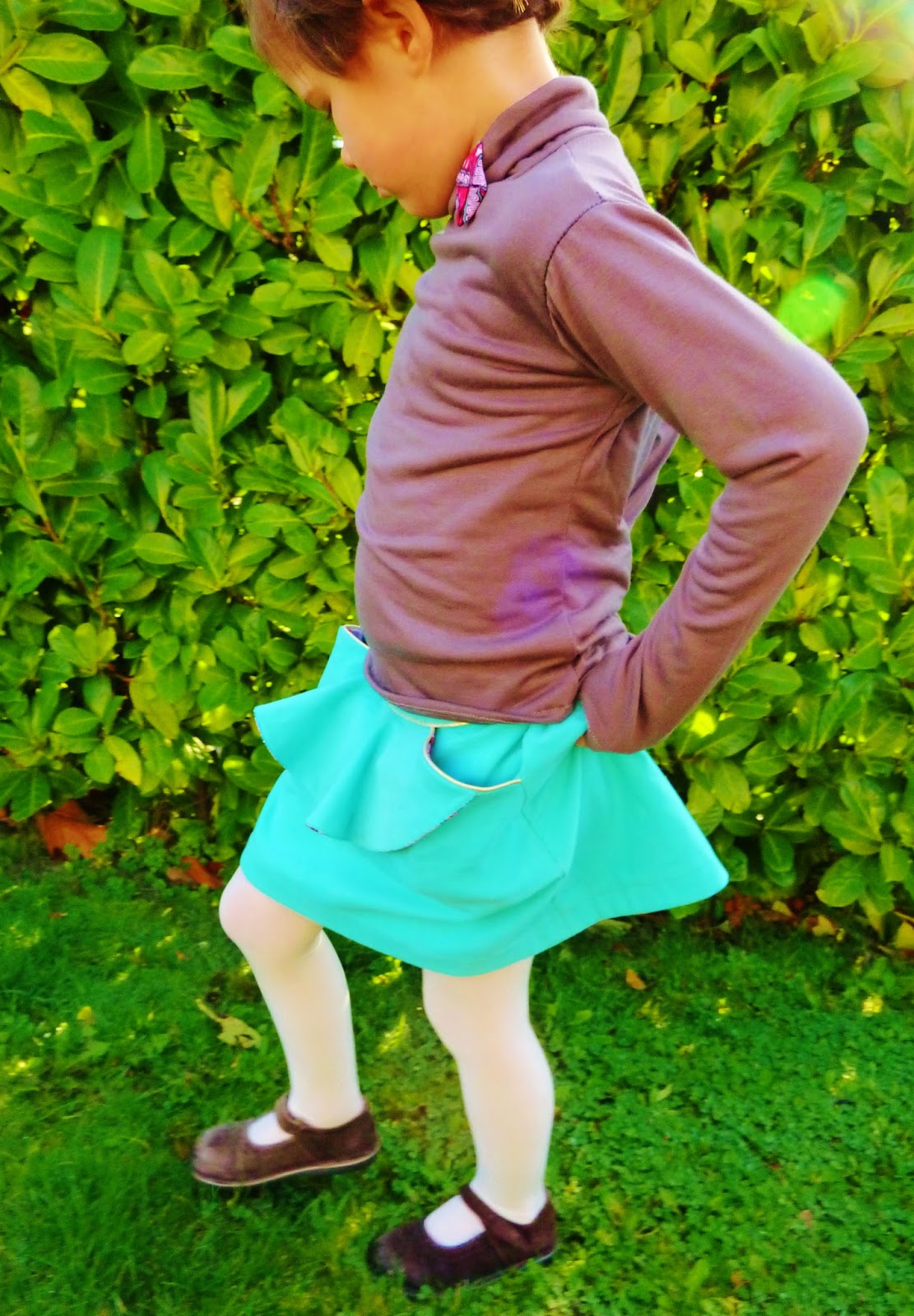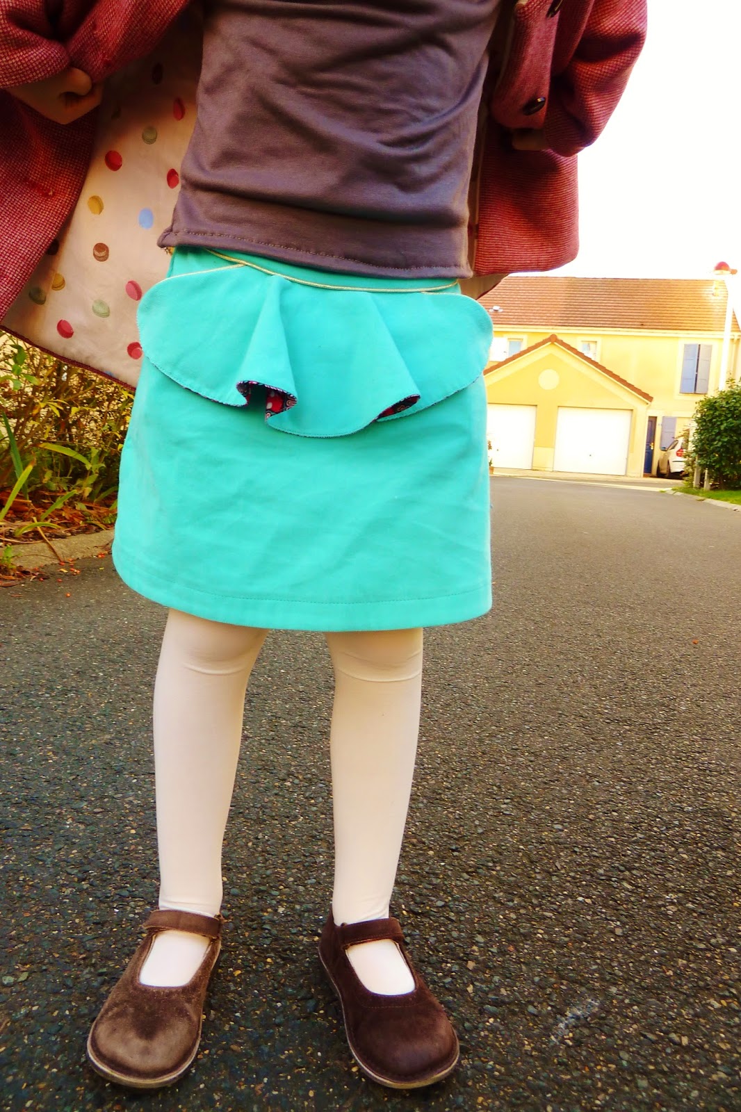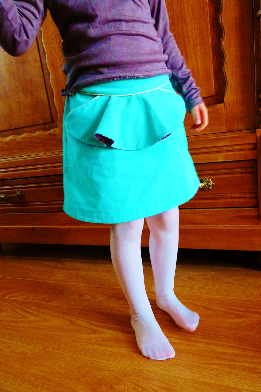 Léontine adore cette jupe, pratique pour l’école grâce à l’élastique et sans doute un peu salissante mais ça, ça m’est égal!