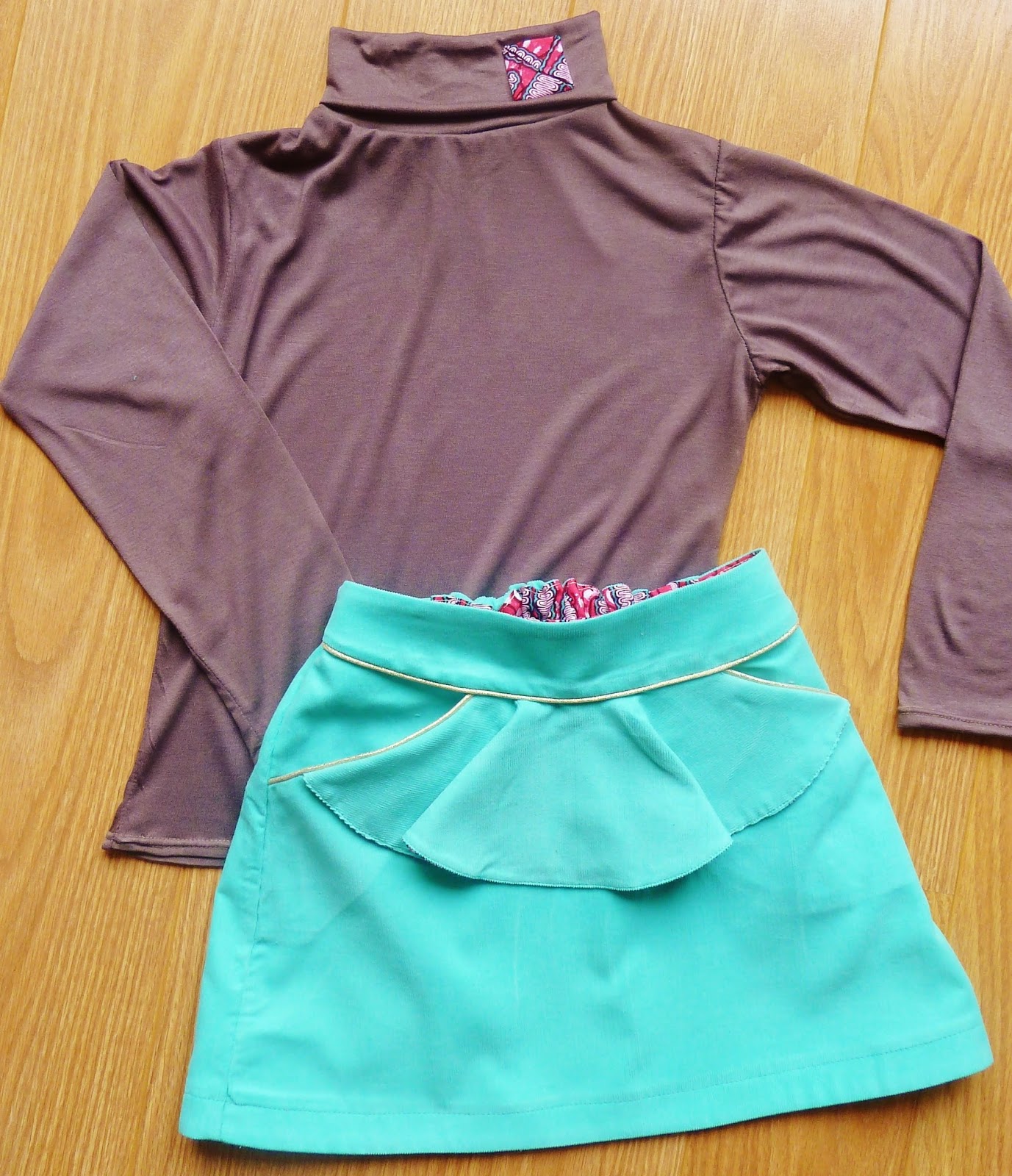 Avec la jupe, j’ai cousu un t-shirt assorti avec un rappel du tissu de la doublure du volant/poches et ceinture réglable, au niveau du col du tish’