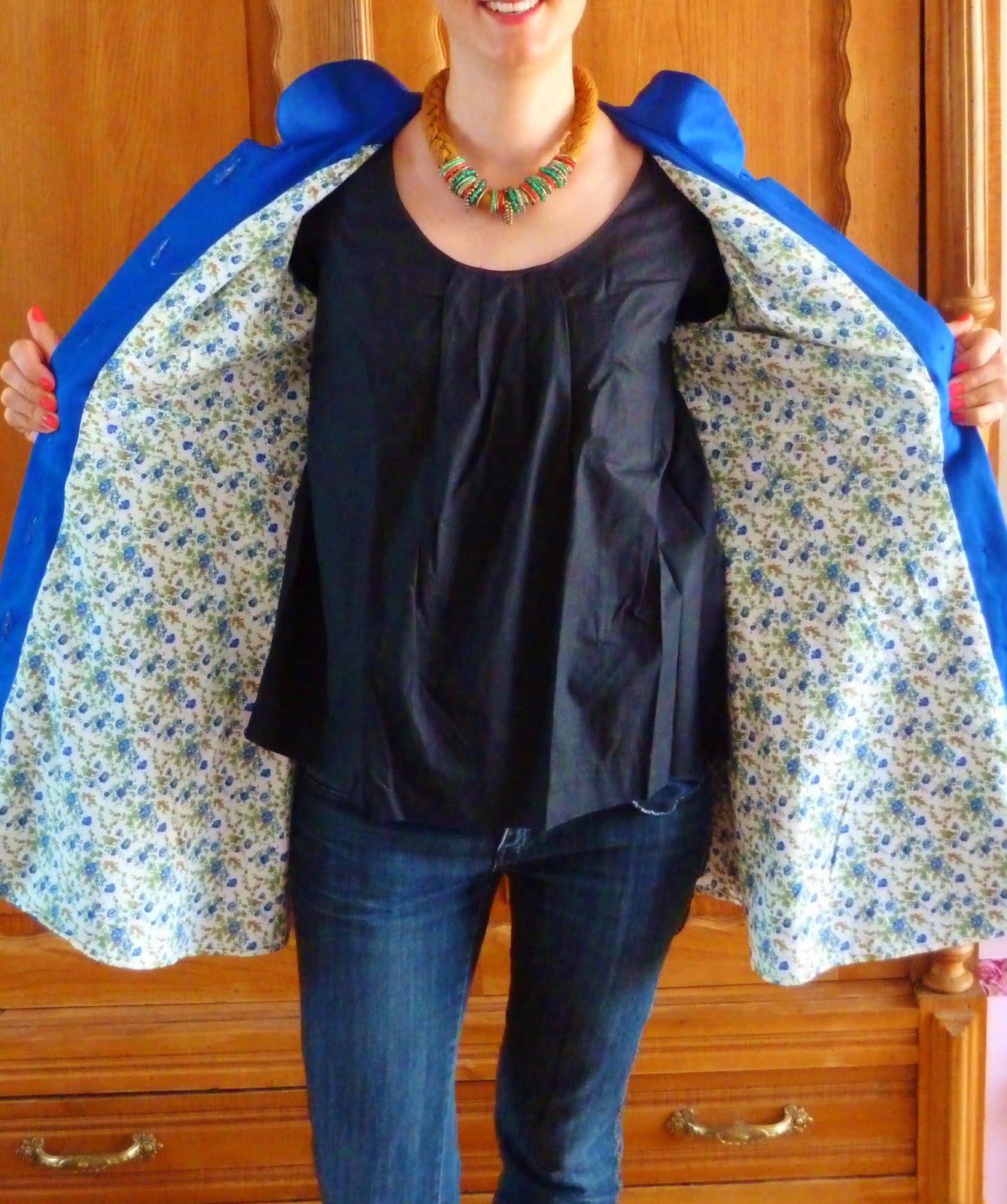 Et voilà la doublure! Des petites fleurs et un rappel du bleu de la veste