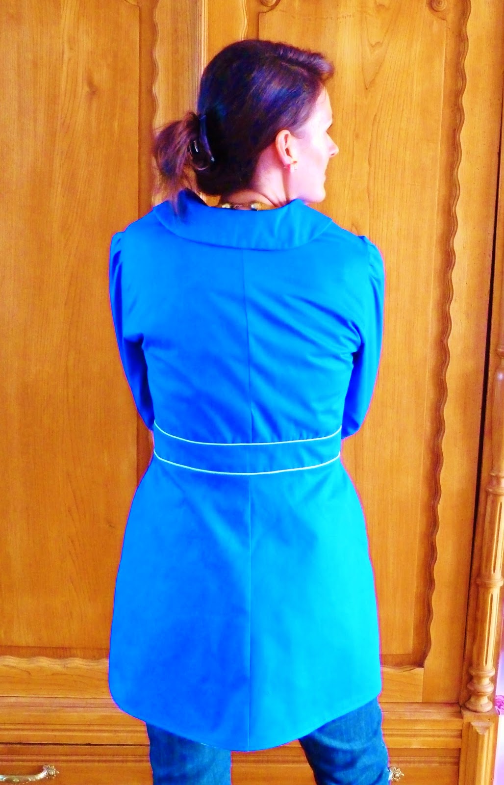 J’ai surfilé toutes les pièces, doublure y compris!!! Comme je suis grande, j’ai aussi du rajouter un peu de tissu au niveau des manches…et donc j’y ai casé le reste de passepoil qu’il me restait!