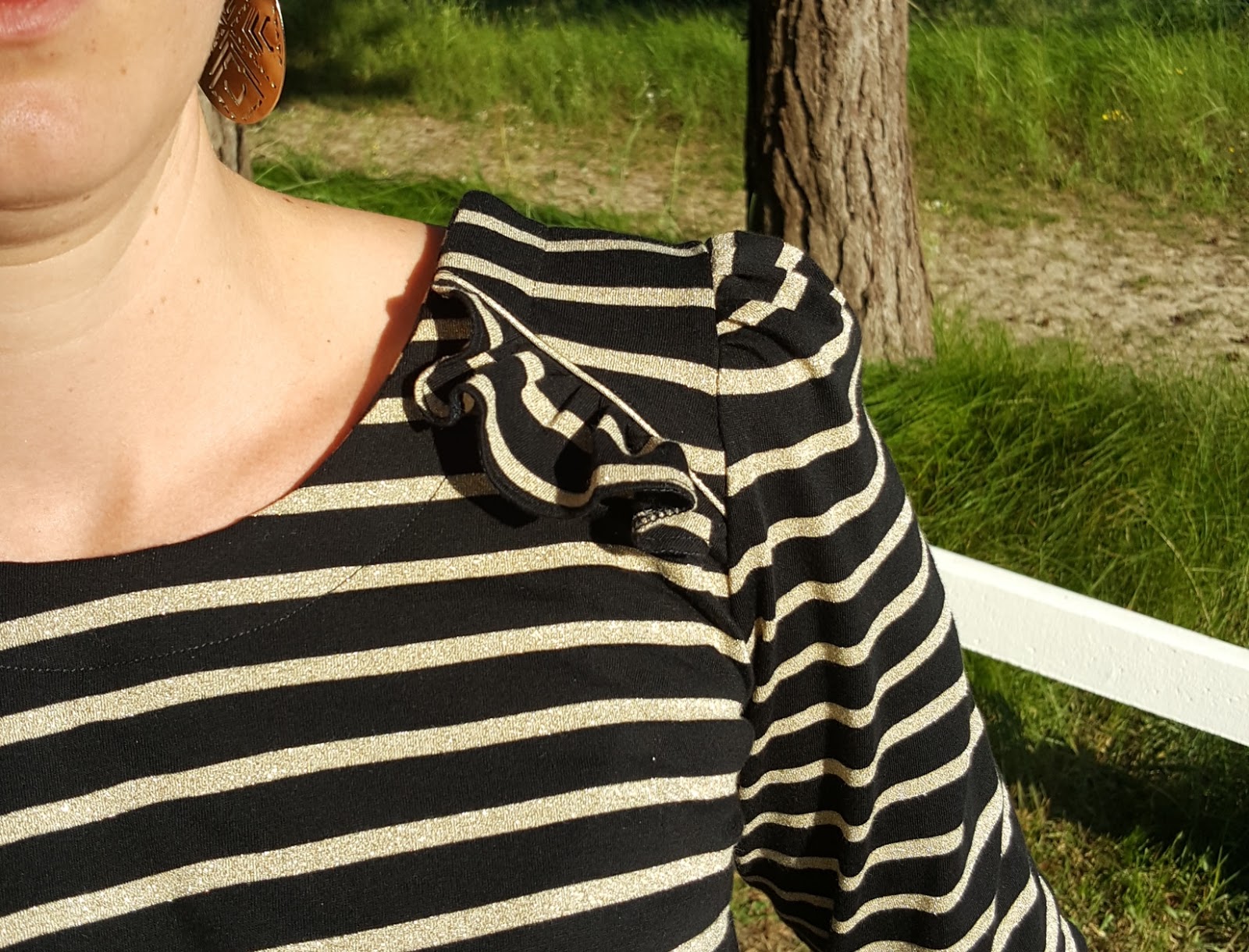 Vas y cherche encore la couture… tu la verras pas !!! Je me suis arrangée pour coudre les épaules entre deux bandes dorées en plein milieu d’une bande noire…