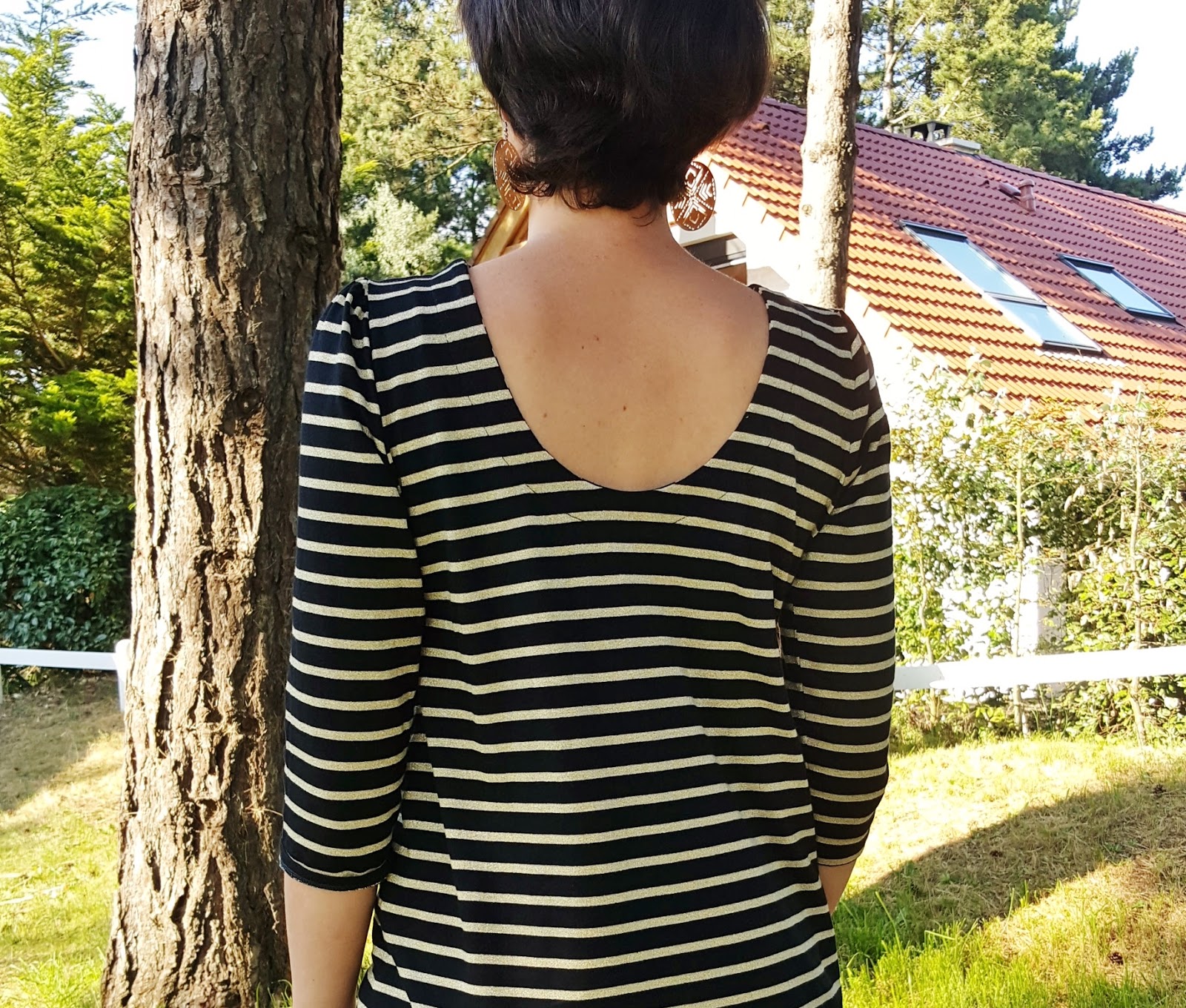 Pfioooou, là t'as géré sur tous les points! Même après les pinces, les rayures sont toujours alignées, chapeau! J'aime beaucoup ce modèle, j'ai acheté le patron il y a quelques mois mais je n'ai pas encore trouvé dans quel tissu le réaliser (ce ne sont pourtant pas les options qui manquent…)
