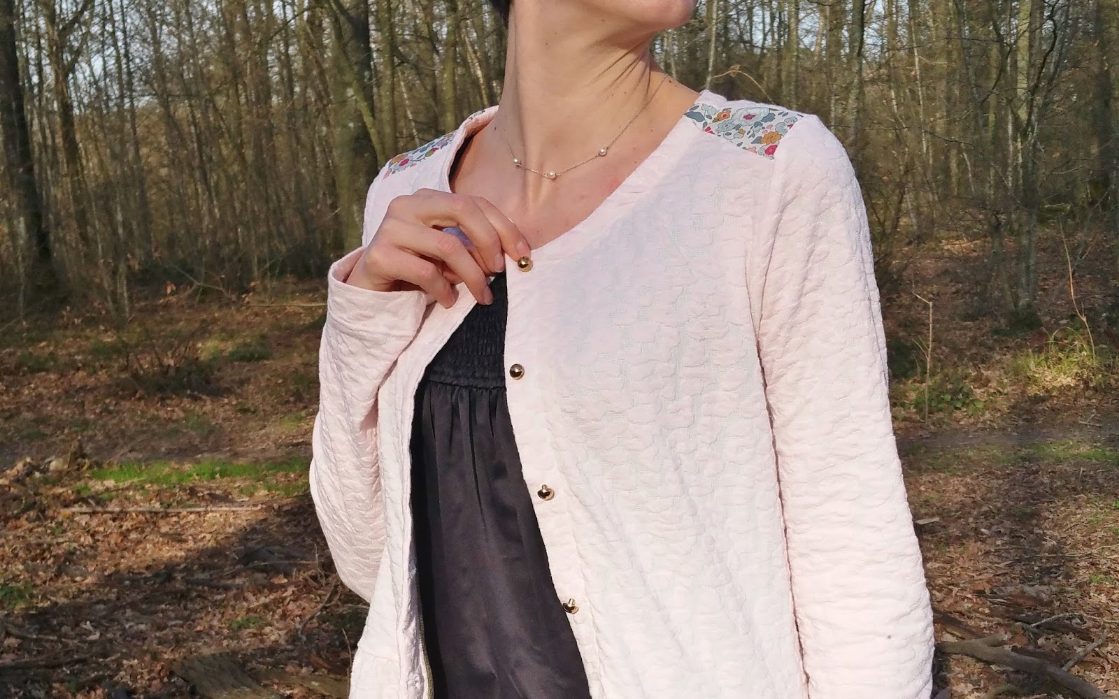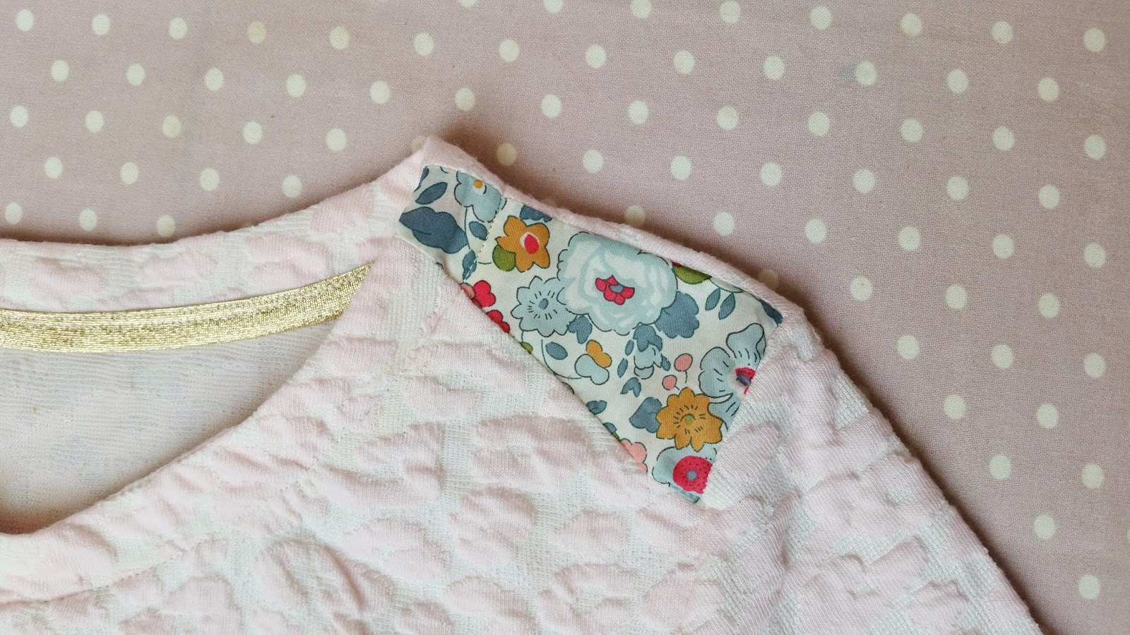 J'adore. Je suis en train de cogiter un modèle du genre avec un jersey rayé bleu et doré. Tes photos me confortent dans mon choix. J'adore l'insertion du liberty. Et les finitions au biais doré sont parfaites. Le rose de ton tissu est parfait.
