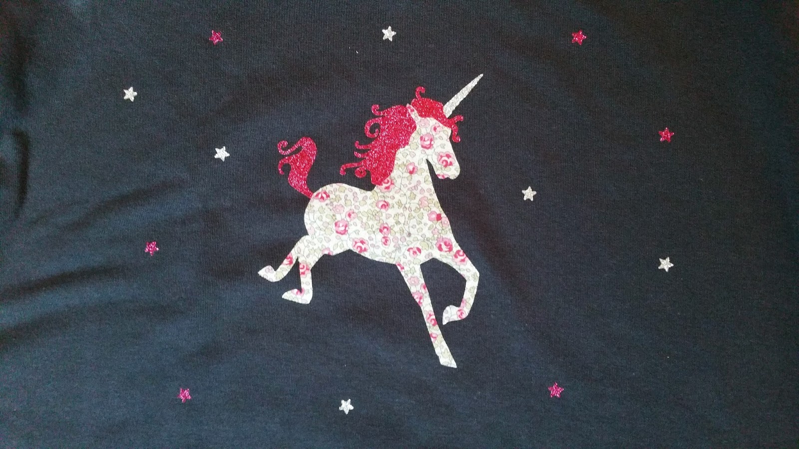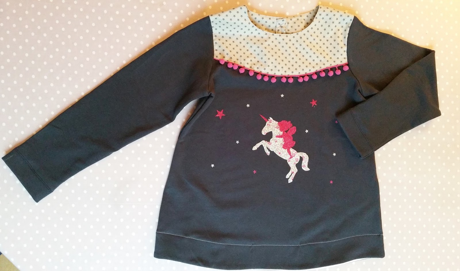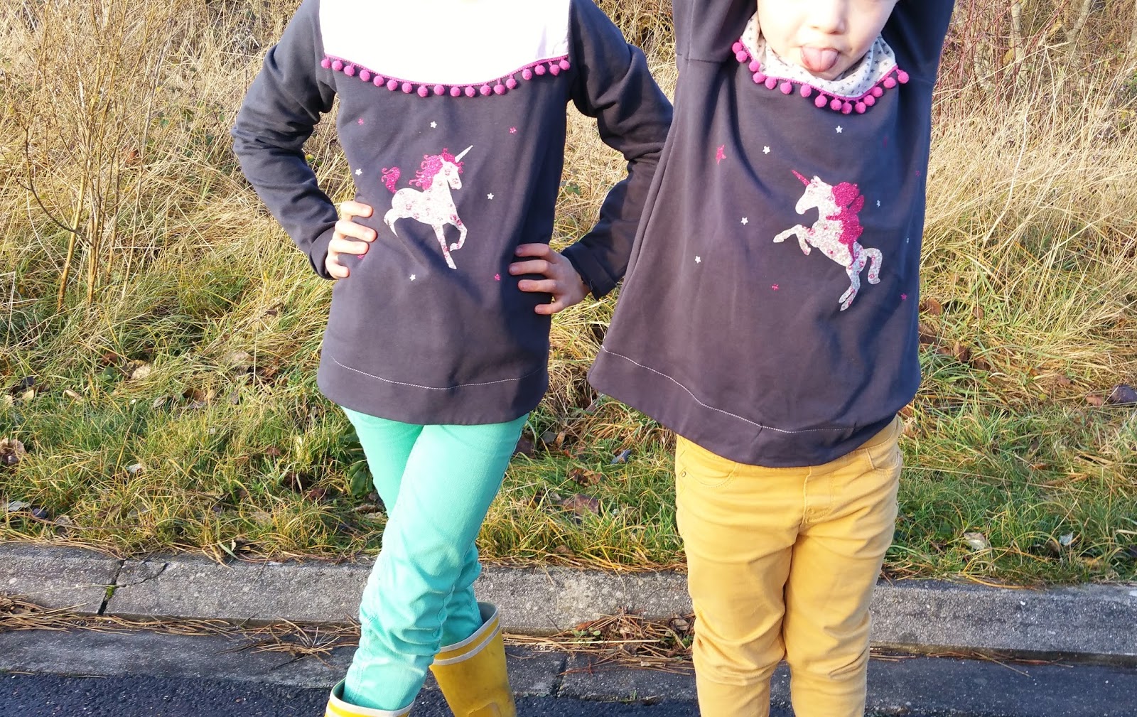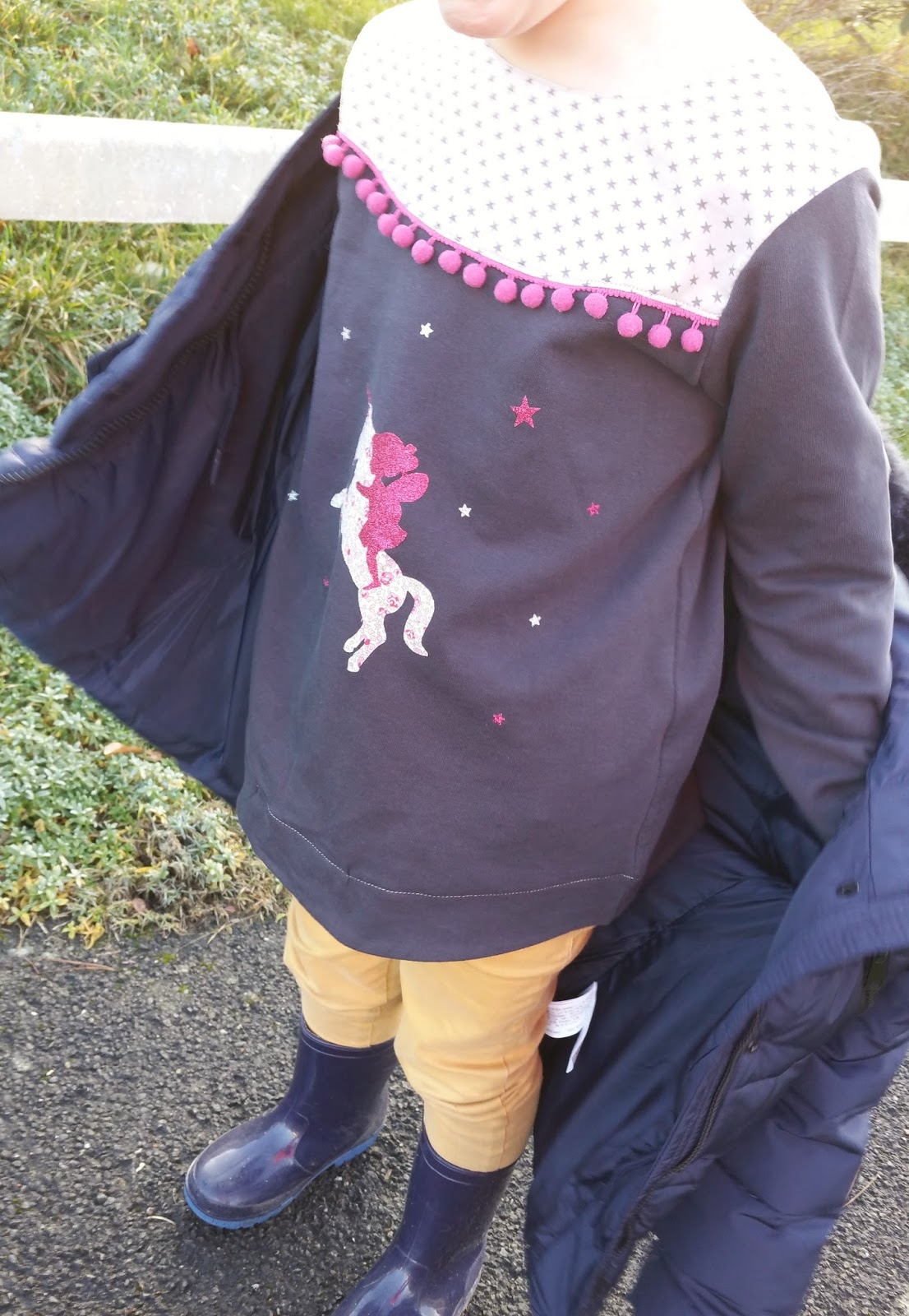 Le patron Sophie sera donc le premier!!!! Un joli sweat pour chacune de mes poulettes, que j’ai décidé d’agrémenter d’un appliqué paillette-licorne-liberty (effet garanti…!!!)