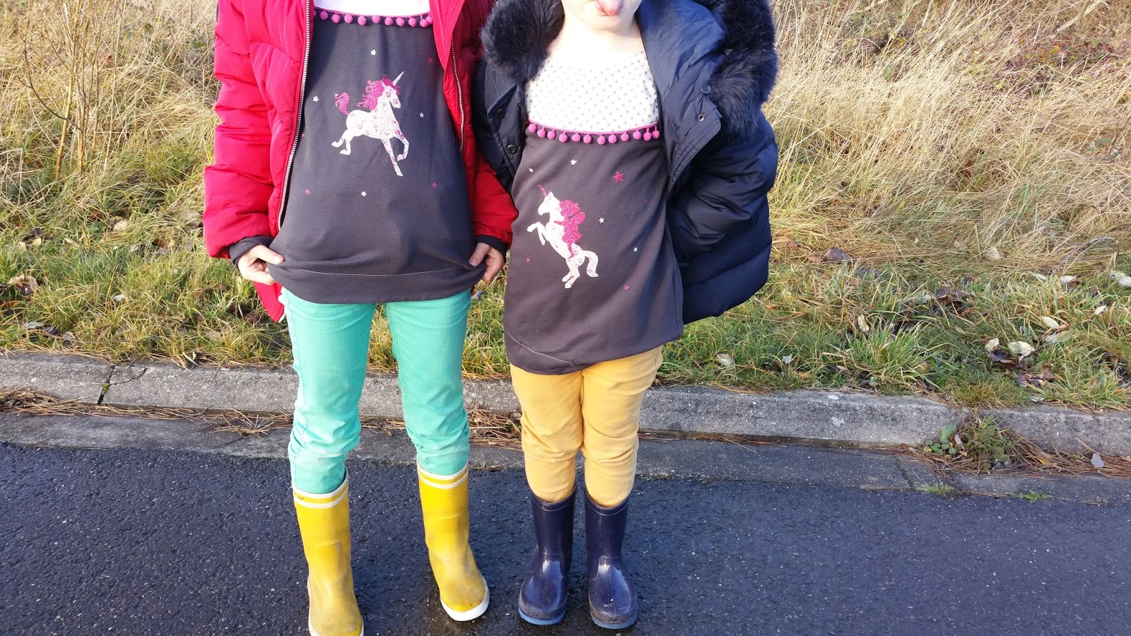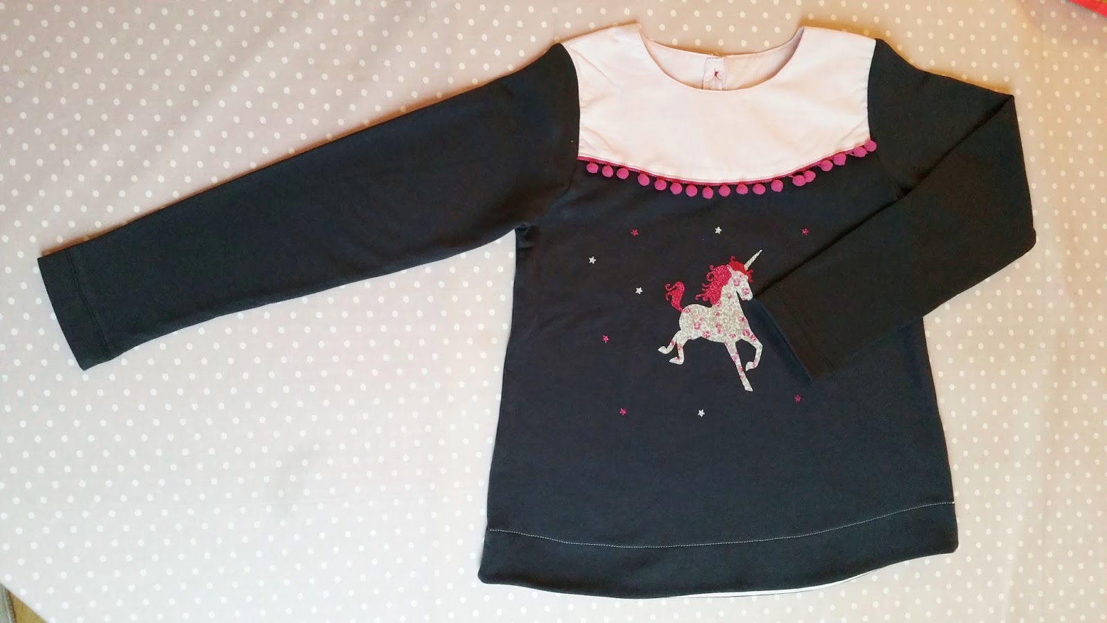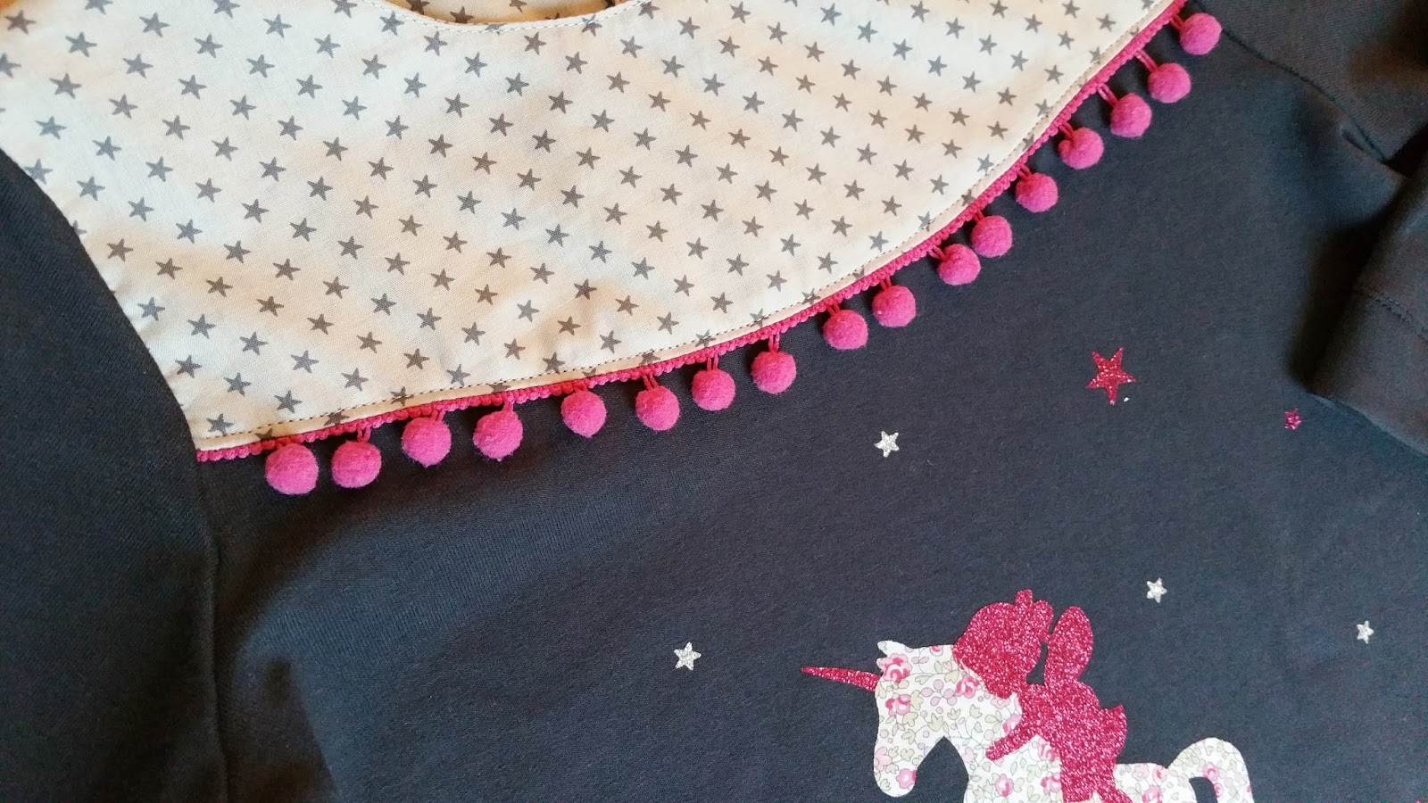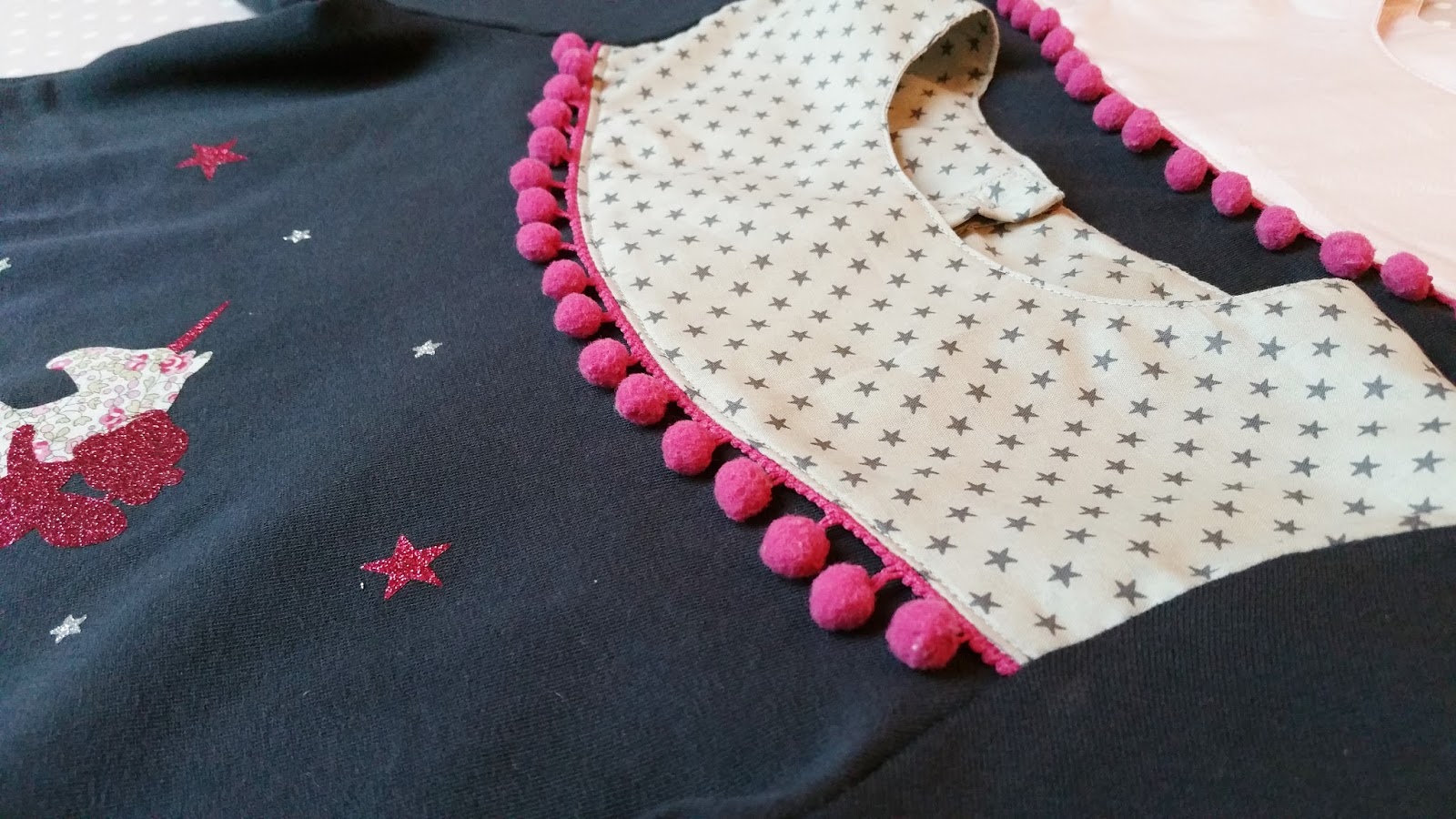 Le patron Sophie sera donc le premier!!!! Un joli sweat pour chacune de mes poulettes, que j’ai décidé d’agrémenter d’un appliqué paillette-licorne-liberty (effet garanti…!!!)