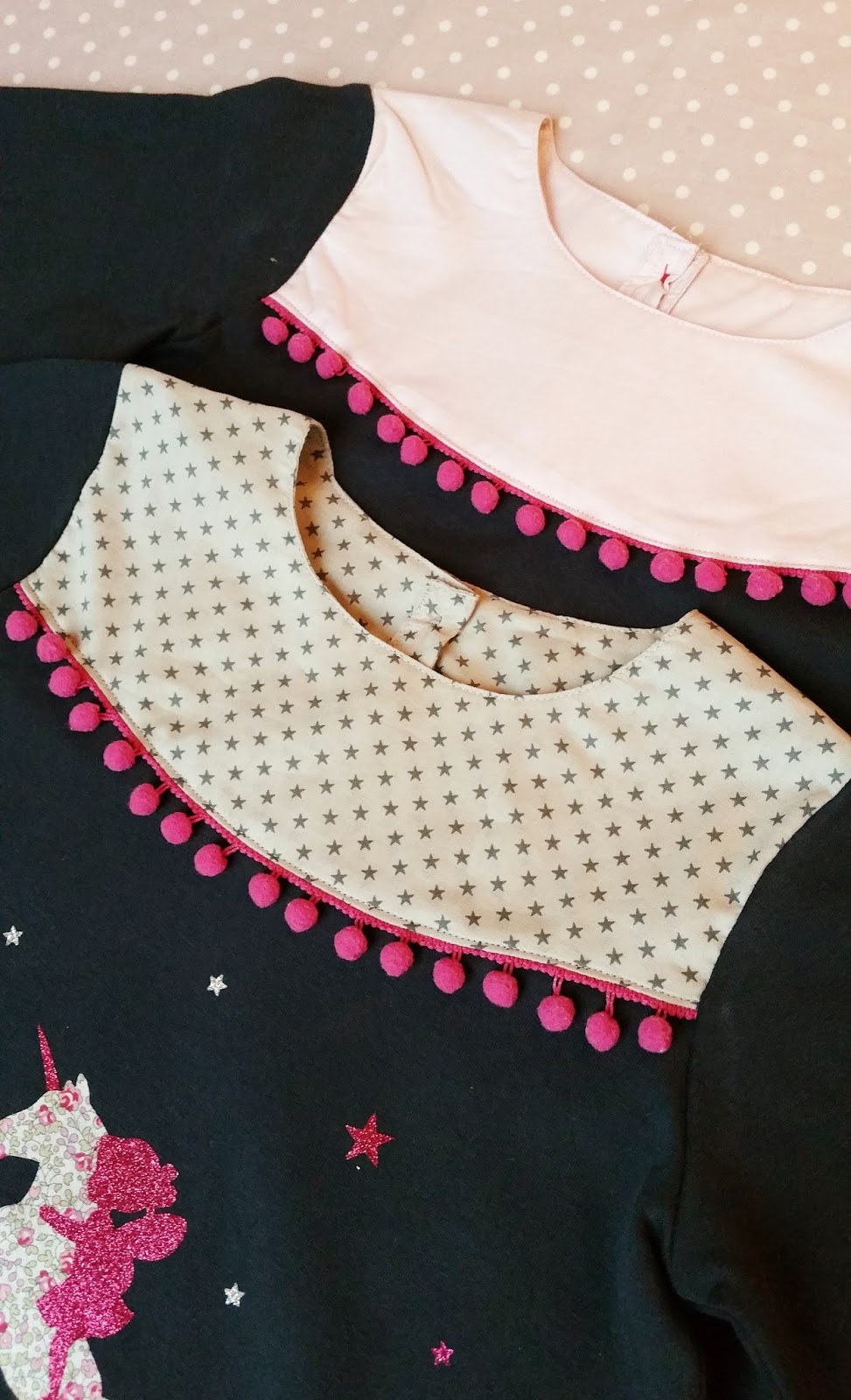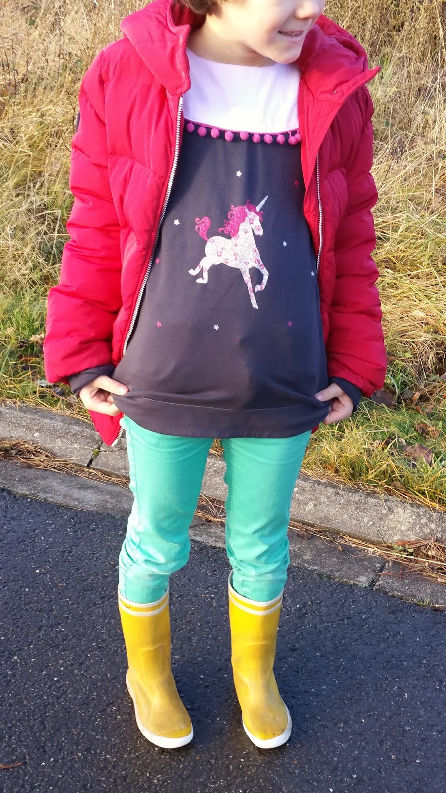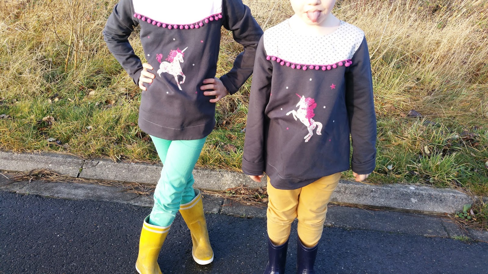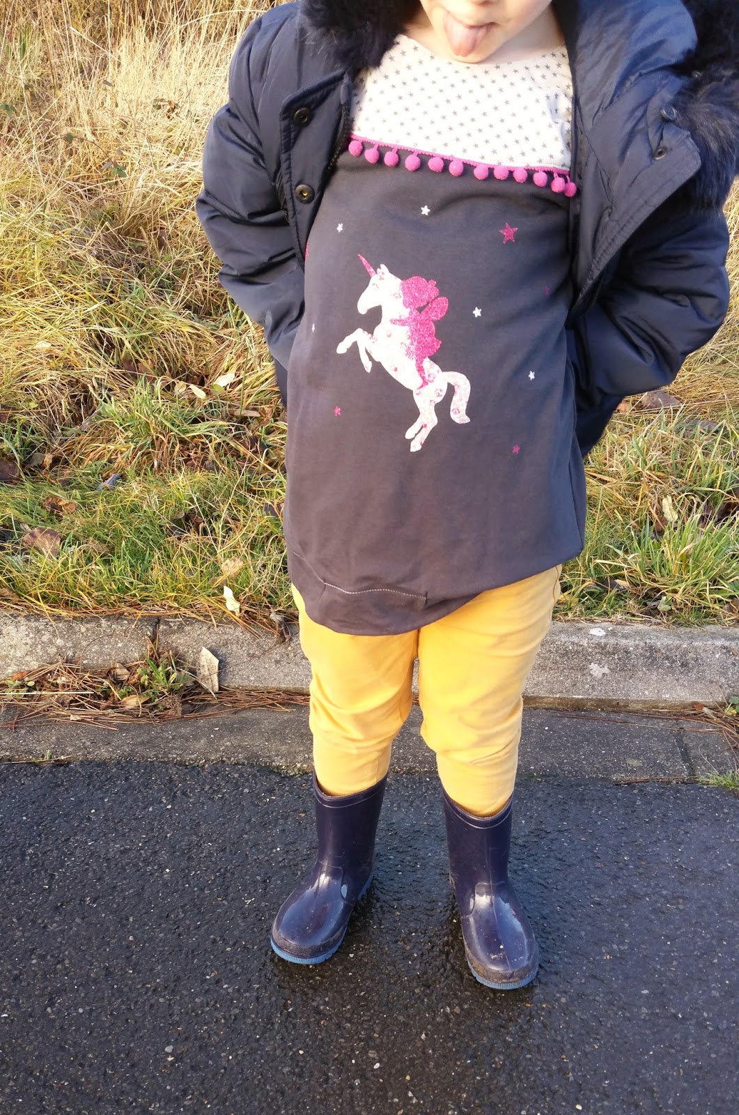 Le patron Sophie sera donc le premier!!!! Un joli sweat pour chacune de mes poulettes, que j’ai décidé d’agrémenter d’un appliqué paillette-licorne-liberty (effet garanti…!!!)