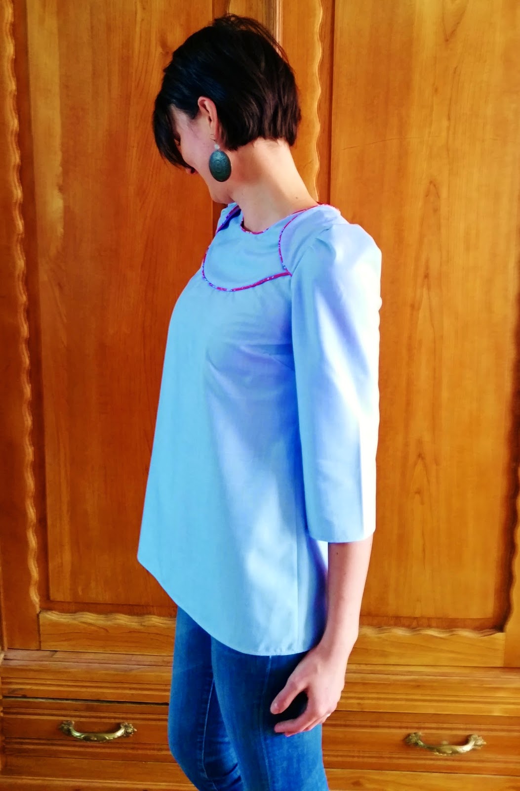 Réalisé en T38 reprise sur les côtés pour un équivalent 36, coton bleu et passepoil liberty-maison