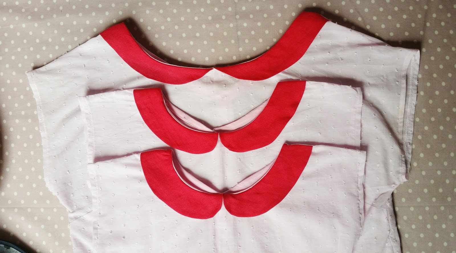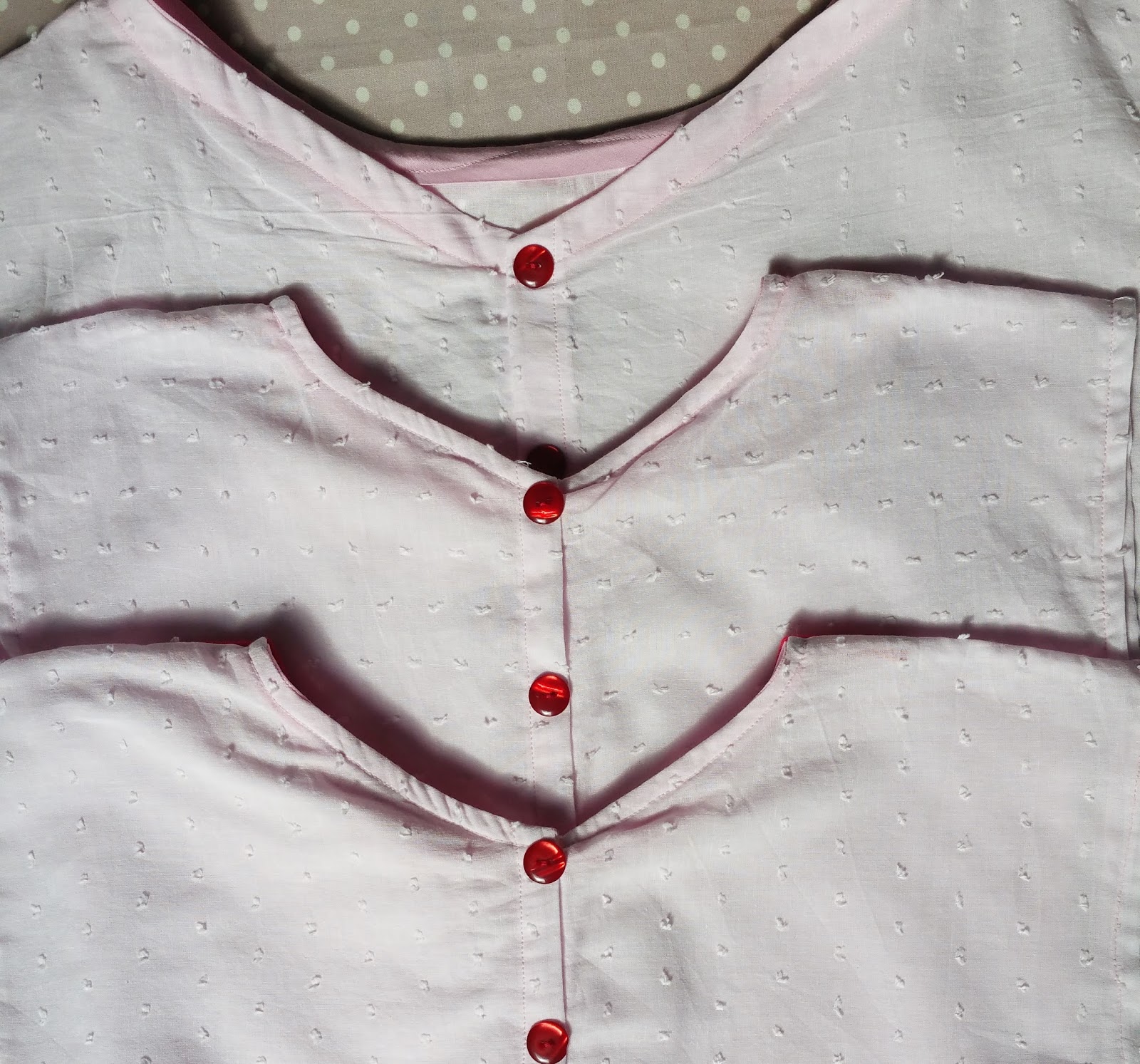 Les trois ont été cousus en plumetis rose clair, version col en lin fuchsia et dos boutonné