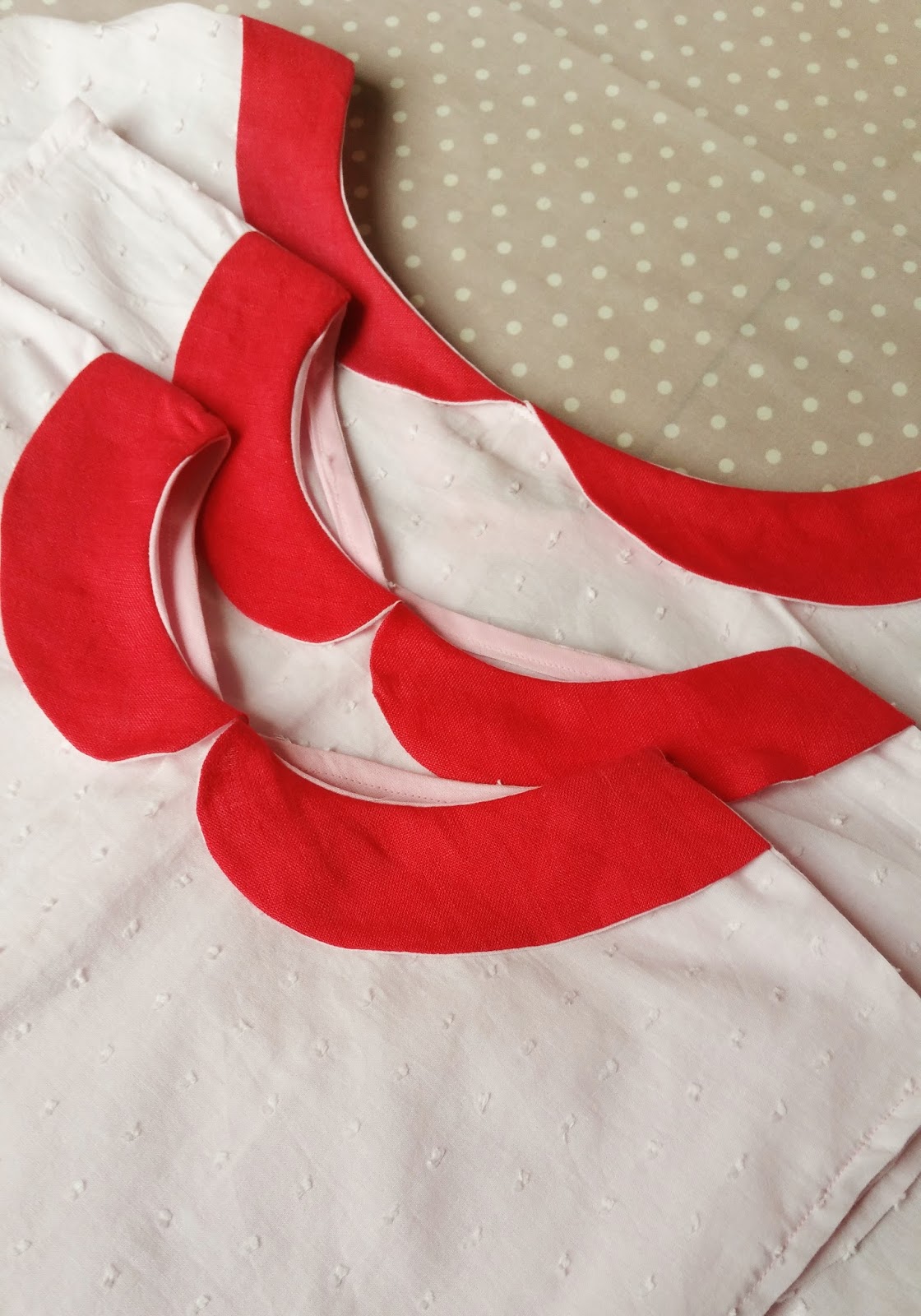 Les trois ont été cousus en plumetis rose clair, version col en lin fuchsia et dos boutonné