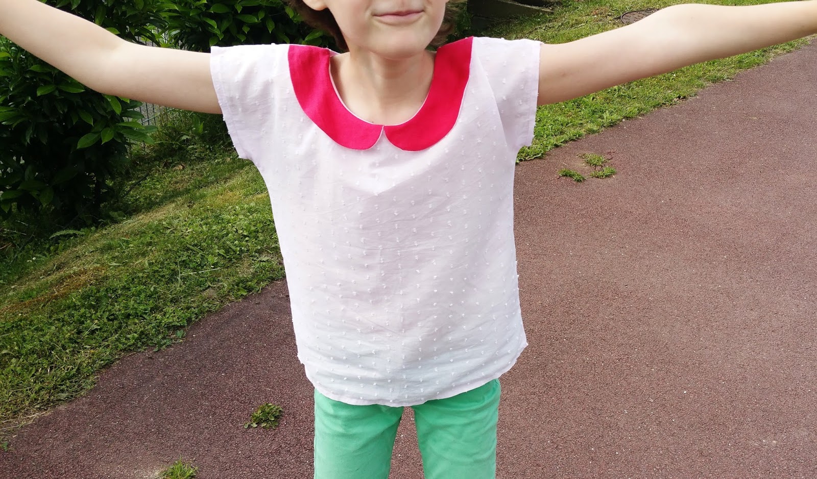Tissu fin = pas de parementure mais un biais rose pour l’encolure et le revers des cols a été réalisé en plumetis pour ne pas trop l’alourdir