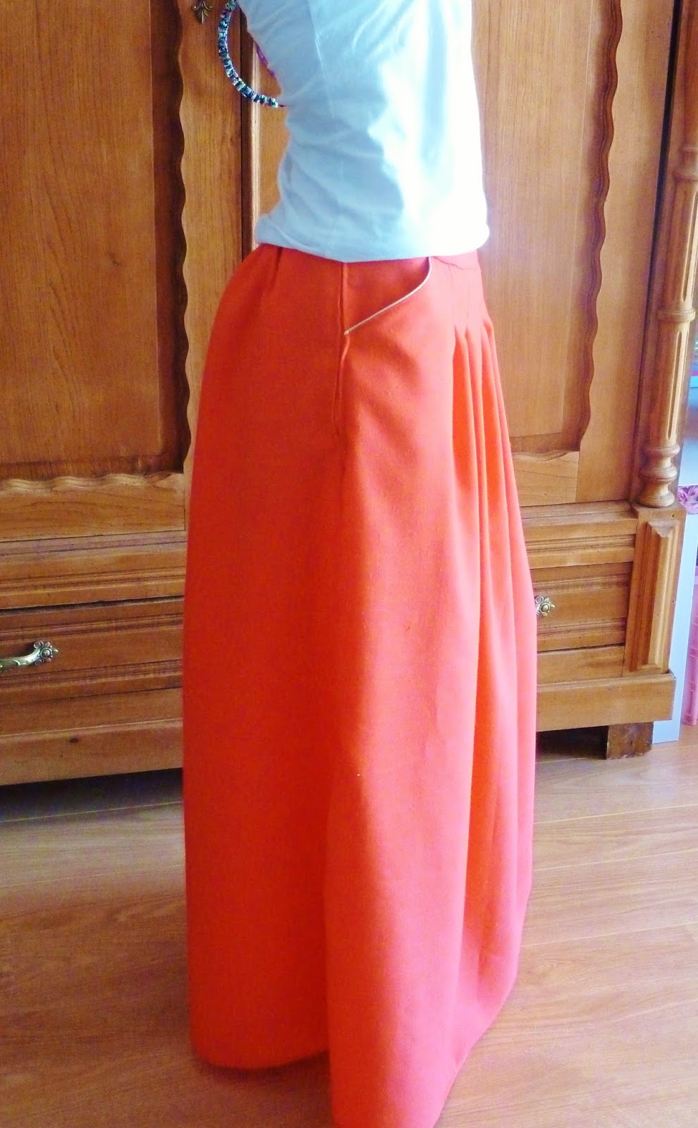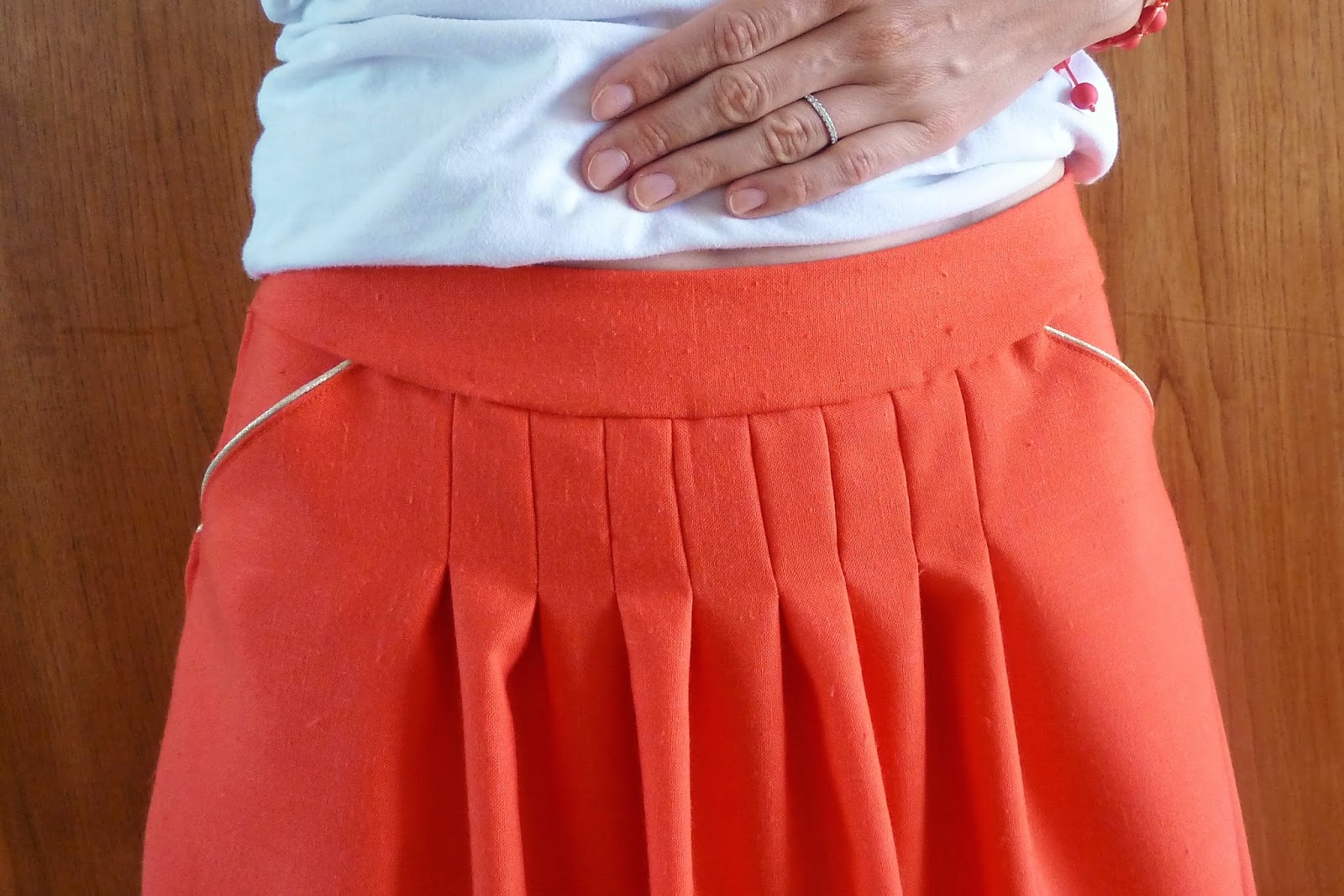 Ensuite, une jupe, ou plutôt une maxi-dress, celle de Grains de couture! Dès la sortie du livre pour hommes et femmes, j’avais rapidement flashé dessus! J’ai aussi flashé sur un tissu mi-lin mi-je-sais-plus-quoi (un synthétique), qui rend le tissu infroissable, mais un peu « lourd ». Mais ce corail, j’adore! Et évidemment, il fallait que je l’associe avec du passpoil doré! Le modèle du livre est la variante de la robe Opale, simplissime à réaliser!